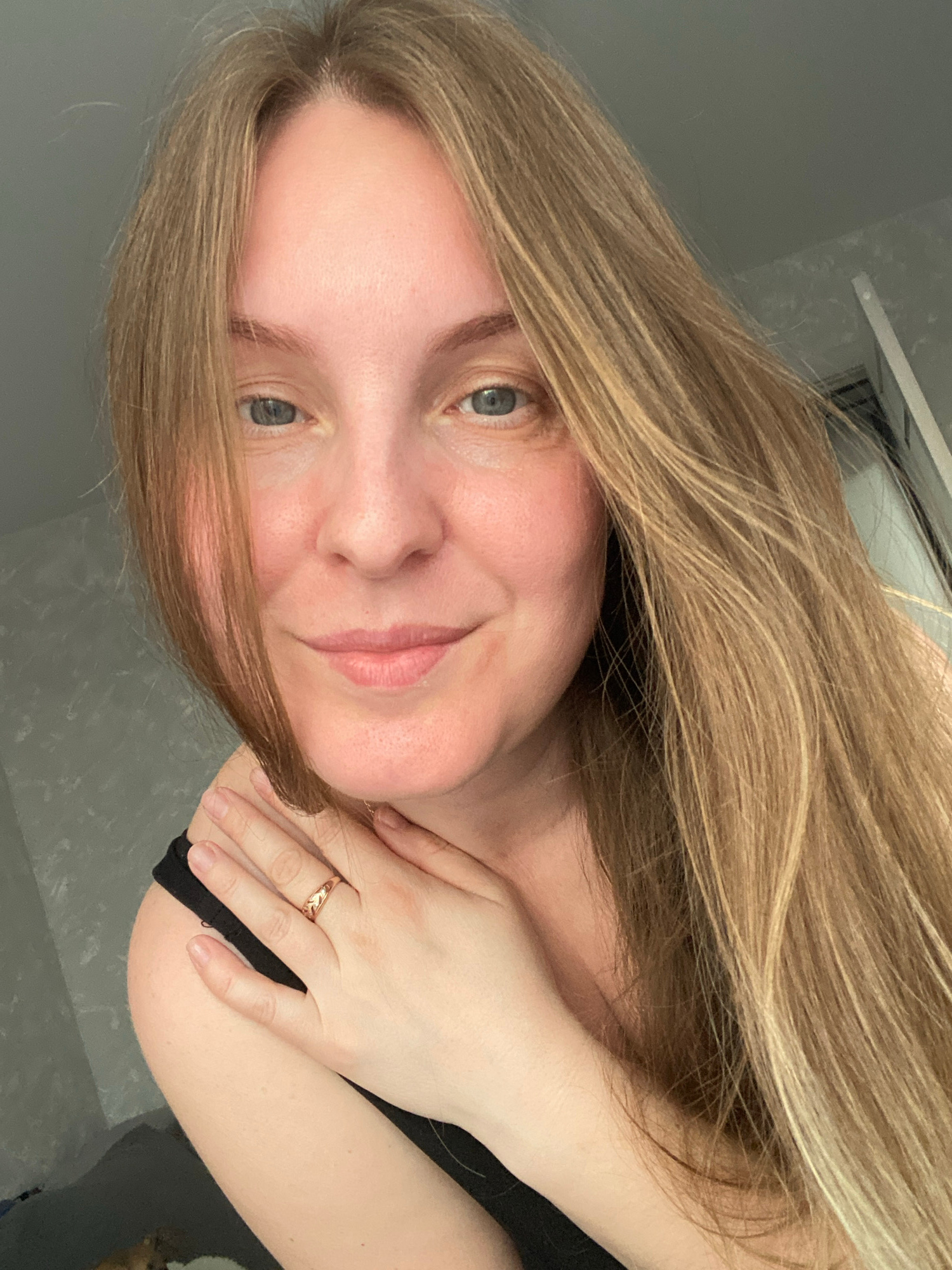 A woman with long blonde hair is photographed in a selfie. She has light skin, blue eyes, and is smiling slightly. She is wearing a black top. Her left hand is visible, and a gold ring is on her ring…read more