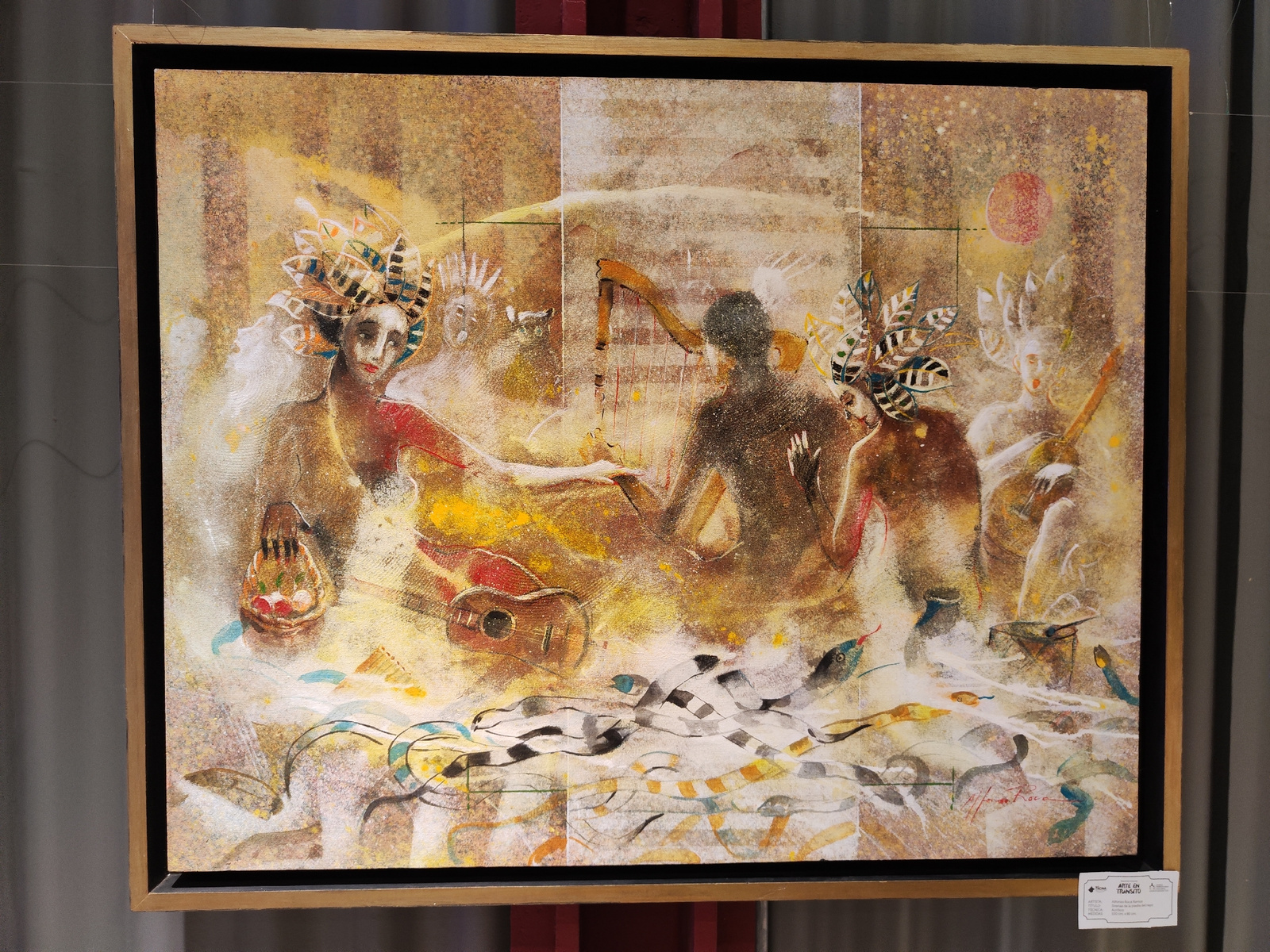 A medium shot captures an artwork displayed in what appears to be a gallery or exhibition space. The painting, framed with a gold-toned outer border and a black inner border, dominates the composition…read more