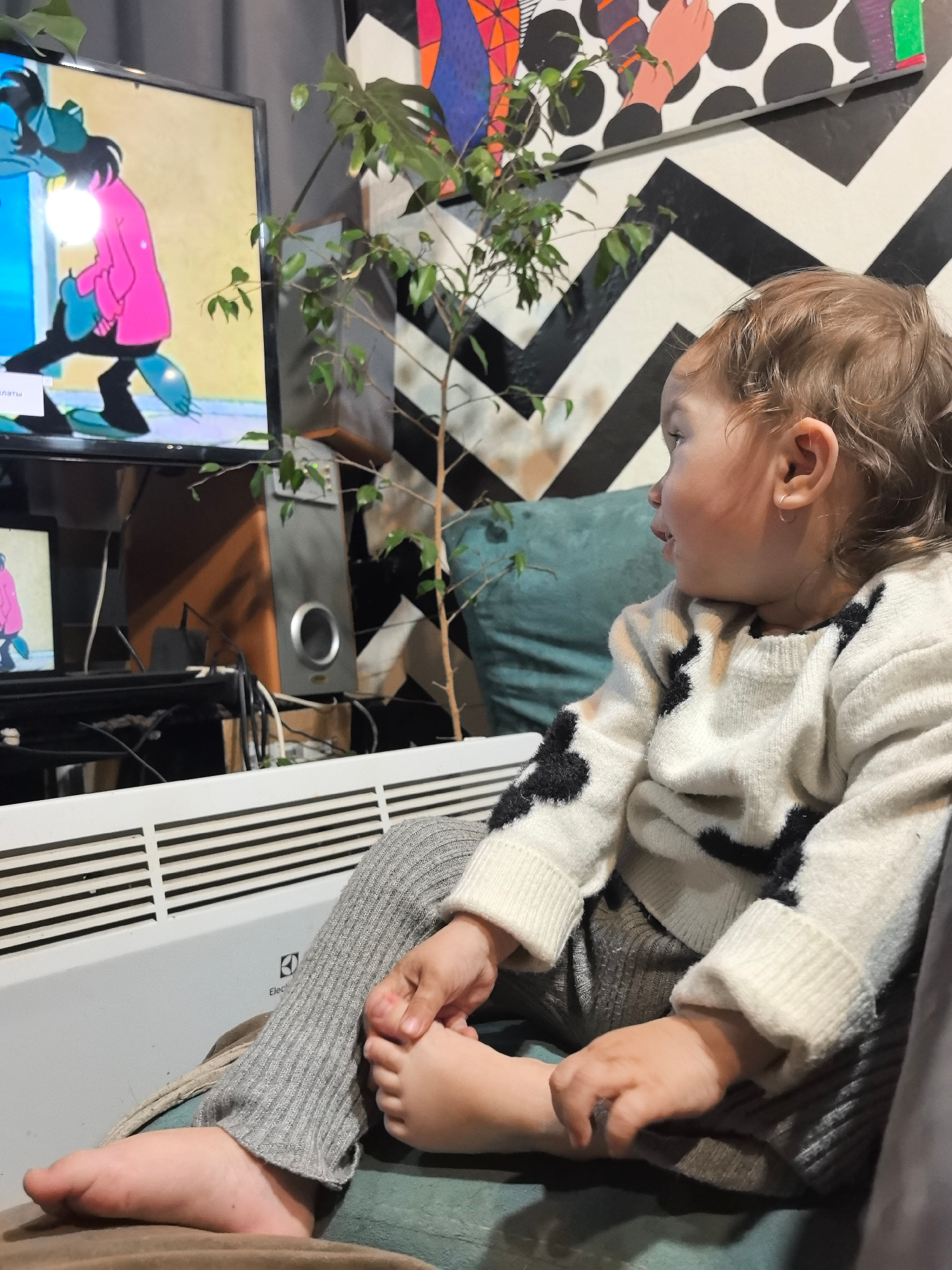 A toddler with light brown, curly hair, wearing a white sweater with black cow spots and gray ribbed leggings, sits on a soft surface. The toddler is barefoot, holding their foot with one hand and hol…read more