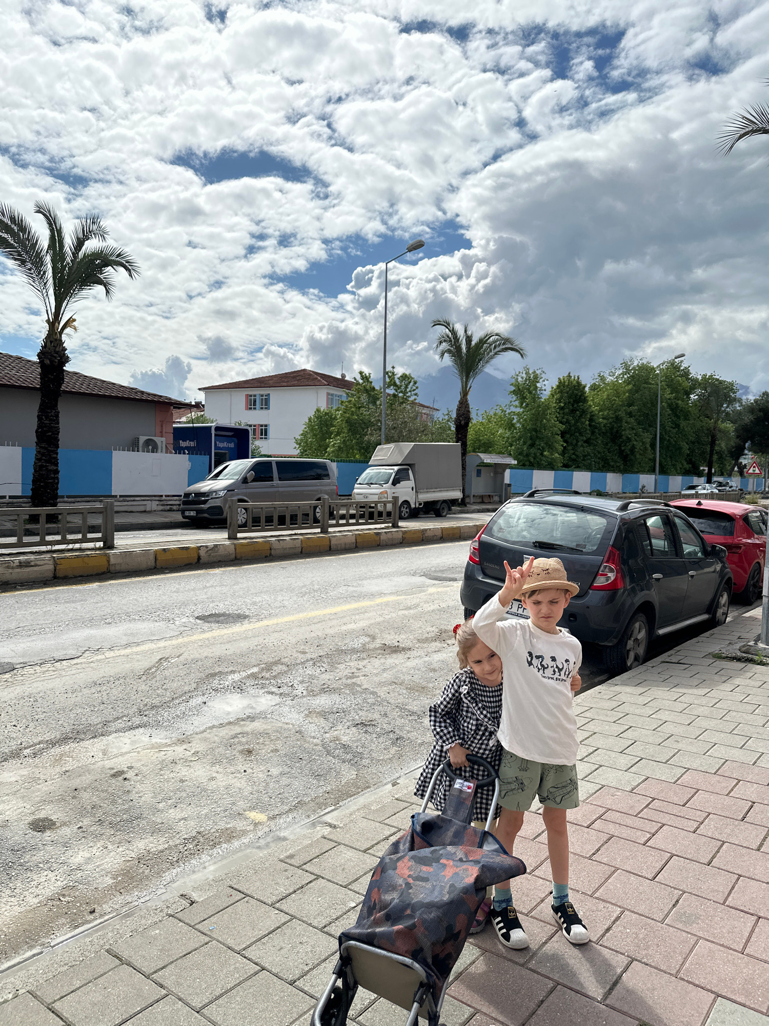On a sunny day in Fethiye, Turkey, two children stand on a sidewalk next to a street lined with parked cars. The older child, wearing a straw hat, white t-shirt, and green shorts, makes a "peace" sign…read more