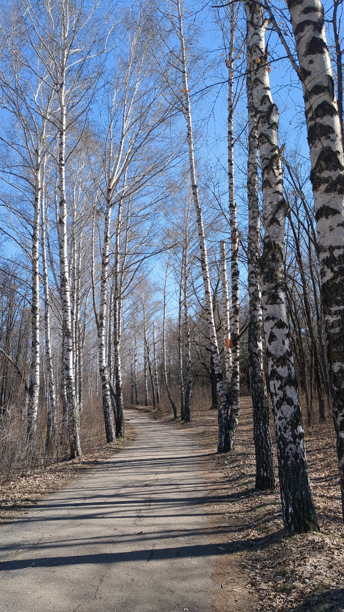 The image shows a path in a birch tree grove, likely in Ulyanovsk, Russia. The path is asphalt and runs along the right side of the frame. Rows of birch trees line the path on both sides, their whiteβ¦read more