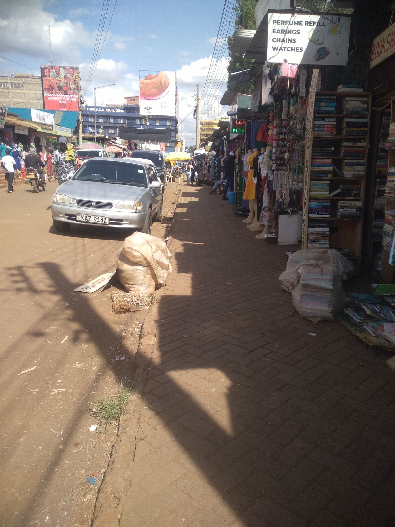 The image shows a street scene in Nyeri, Kenya. A silver car with license plate KAZ 918Z is parked on the side of the road near a bag. A sign for "BOOKS SALE" leans against the bag. The street is line…read more