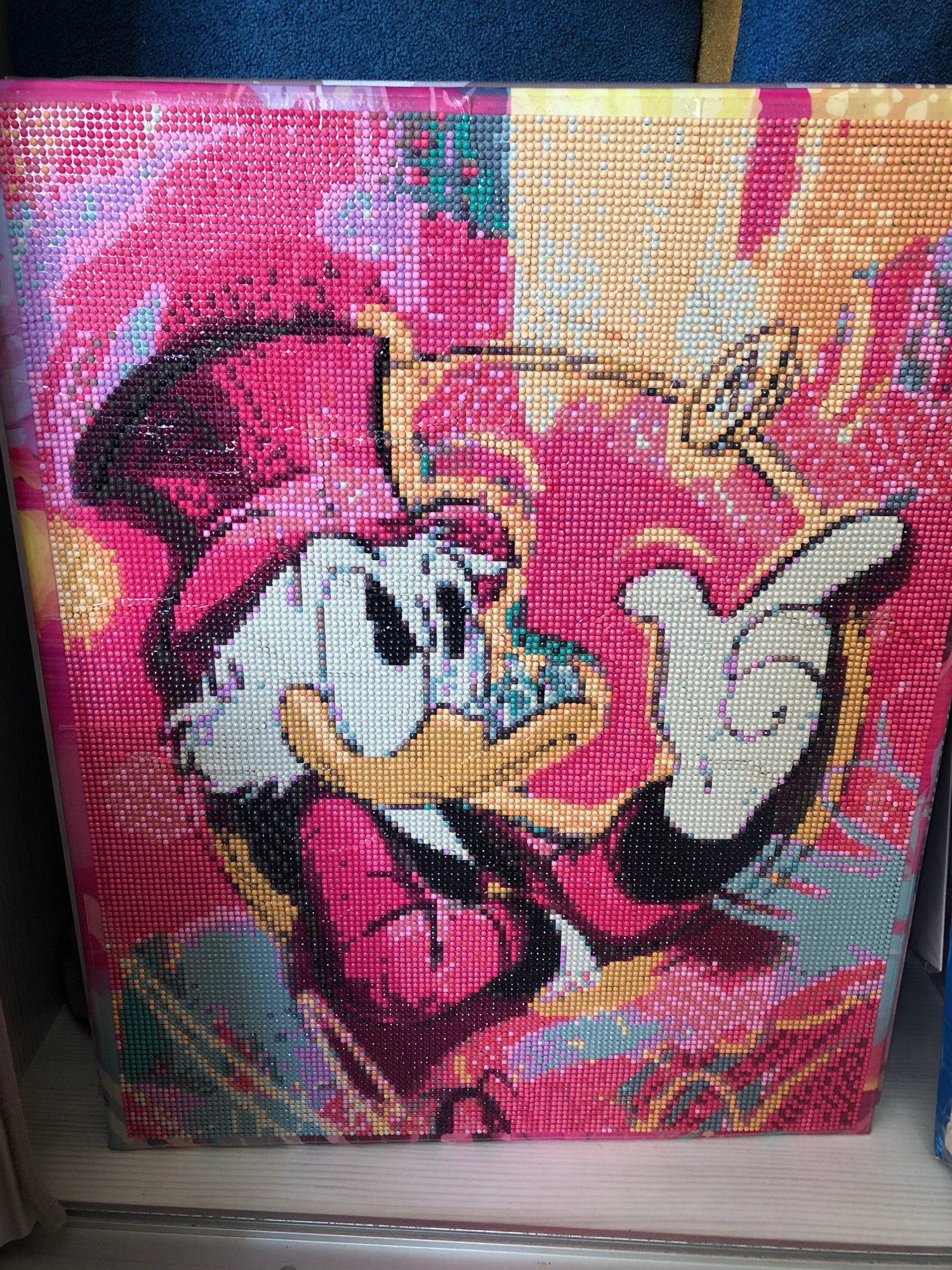 The image depicts a partially completed diamond painting of Mickey Mouse holding a cat, with a primarily pink and yellow color scheme. The painting appears to be on a canvas stretched over a frame. Thβ¦read more