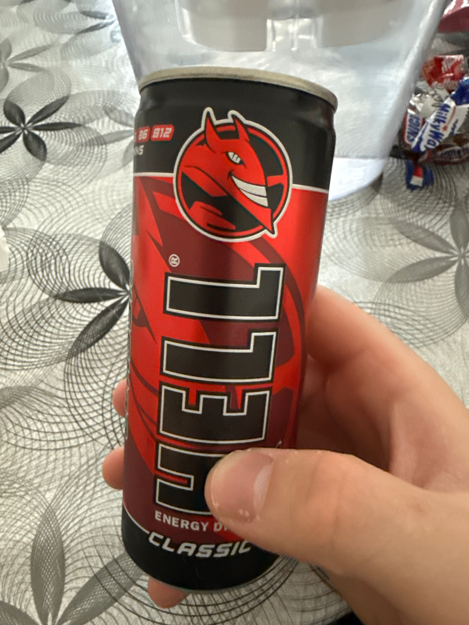 A hand holds a red and black "Hell" energy drink can. The can features a red devil logo within a circle. Part of a clear plastic container and a "Milky Way" candy wrapper are visible in the background…read more