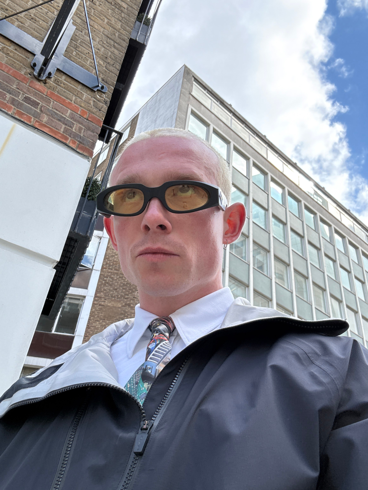 A low-angle, tilted selfie shows a light-skinned person with short, bleached blonde hair, wearing black sunglasses with yellow-tinted lenses. They are dressed in a white button-down shirt with a multi…read more