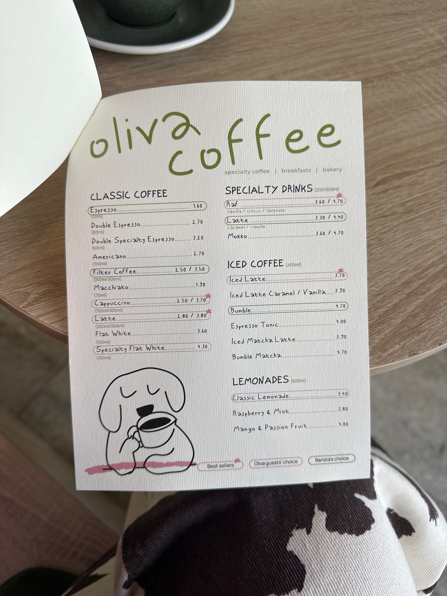 A top-down, slightly rotated, medium shot of a menu, primarily white with green text, on a light brown surface, likely a table. The menu is open, displaying a list of coffees and lemonades from "oliva…read more