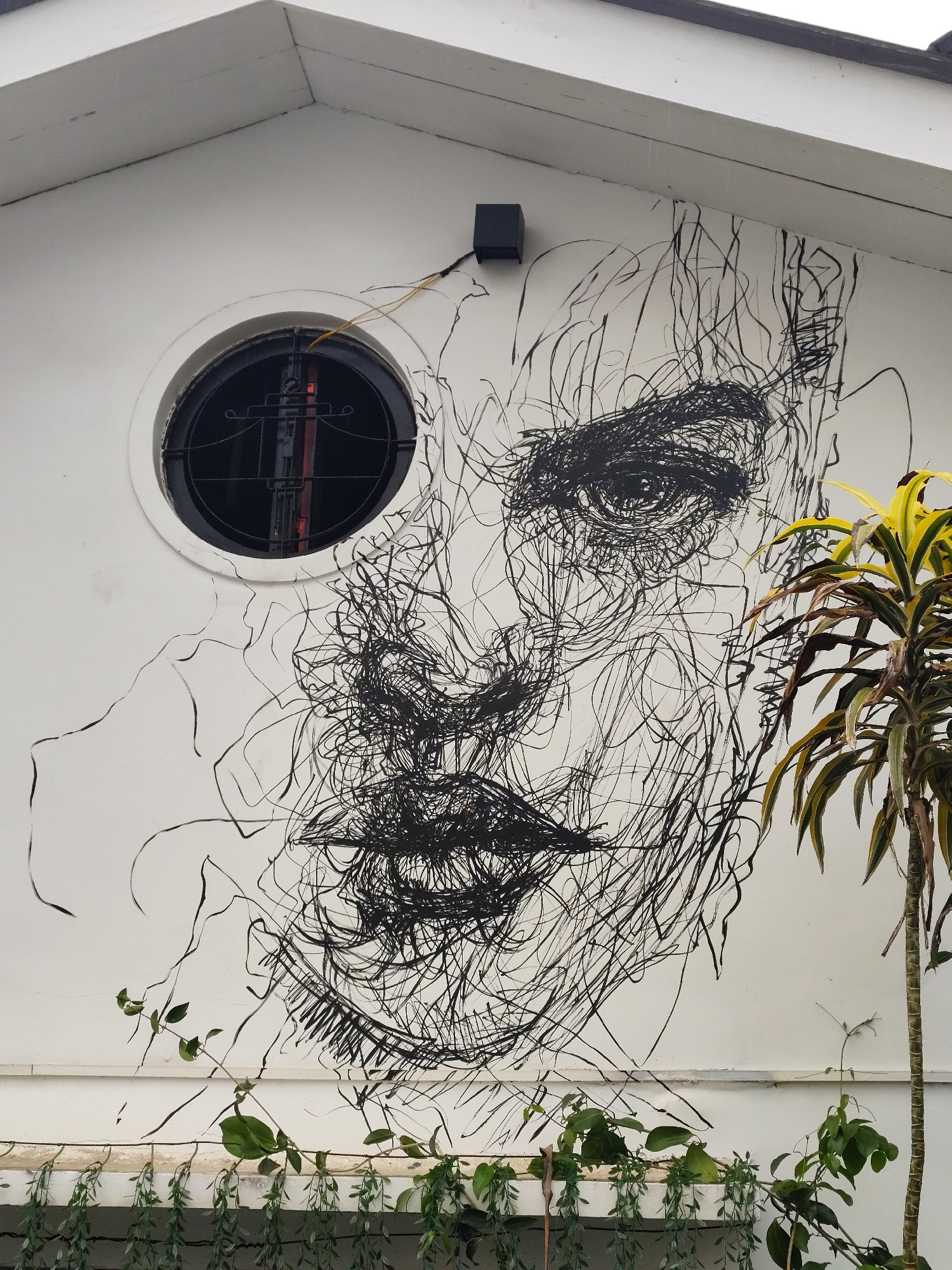 A low-angle shot shows a stylized black-and-white mural on the exterior wall of a building in Da Lat, Vietnam. The mural depicts a human face composed of chaotic, scribbled lines that form the feature…read more
