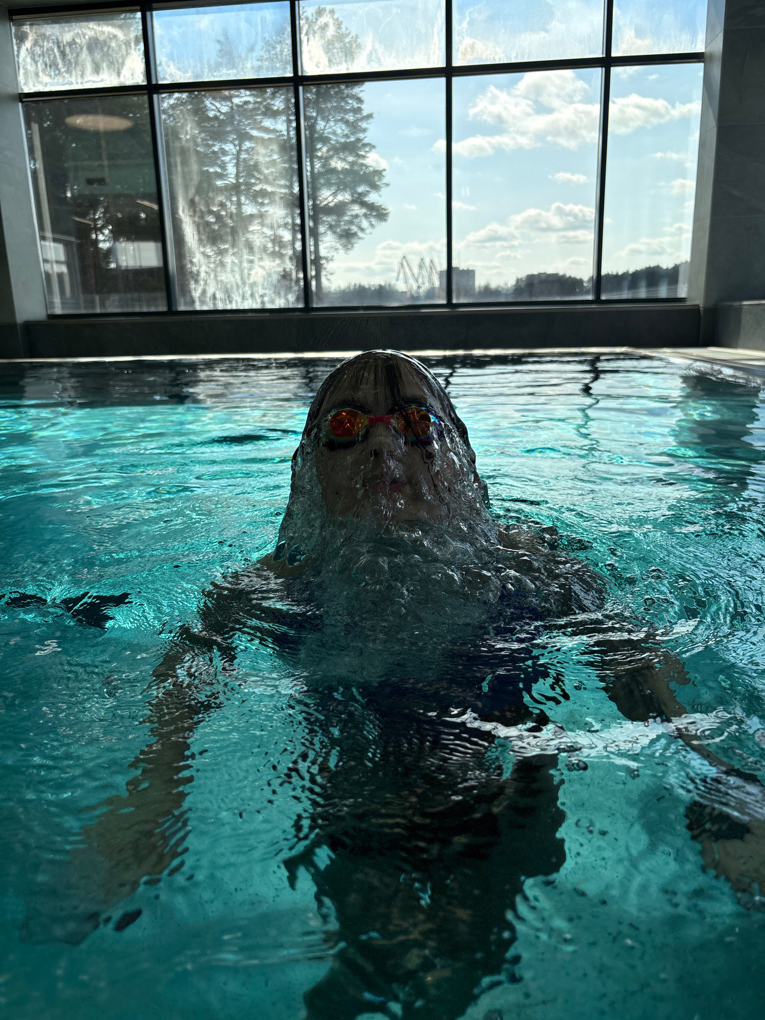 A person is swimming in an indoor pool. The person is wearing goggles and their head is above the water. Bubbles and ripples are visible in the water around the person's head. A large window is visibl…read more