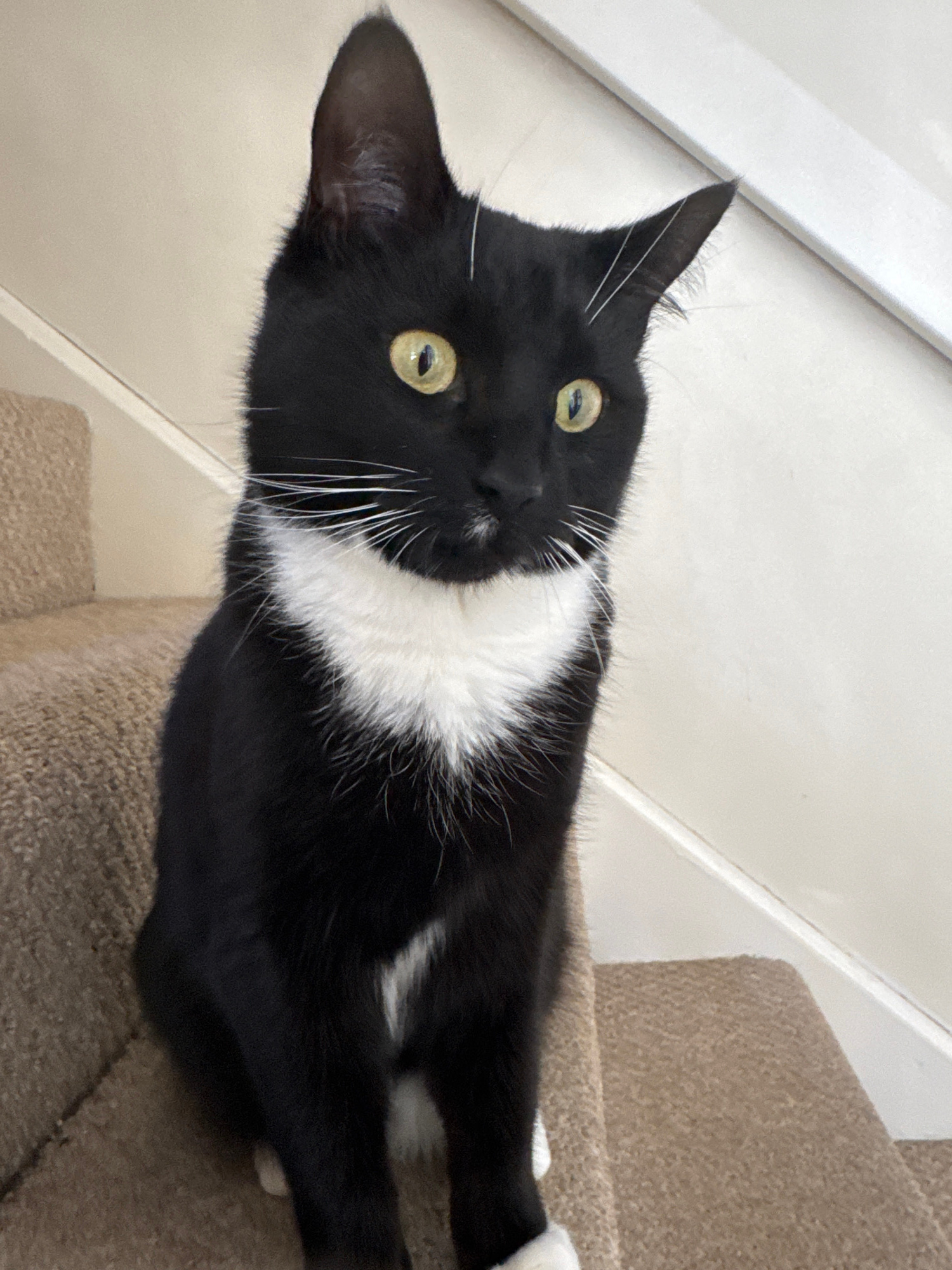 A black and white tuxedo cat is lying on a carpeted staircase. The cat is positioned with its head facing the camera, its green-yellow eyes wide and alert. Its white bib extends down its chest. The ca…read more