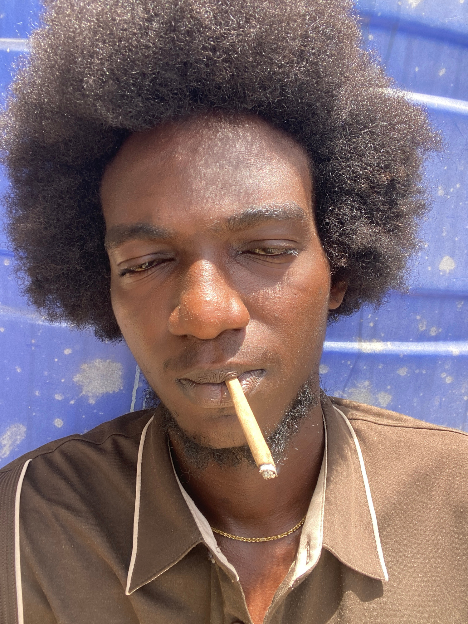 A man with dark skin and an afro is lying on his side on a blue surface. He is wearing a brown shirt with white trim and a gold chain. He has a cigarette in his mouth. The photograph was taken outdoor…read more
