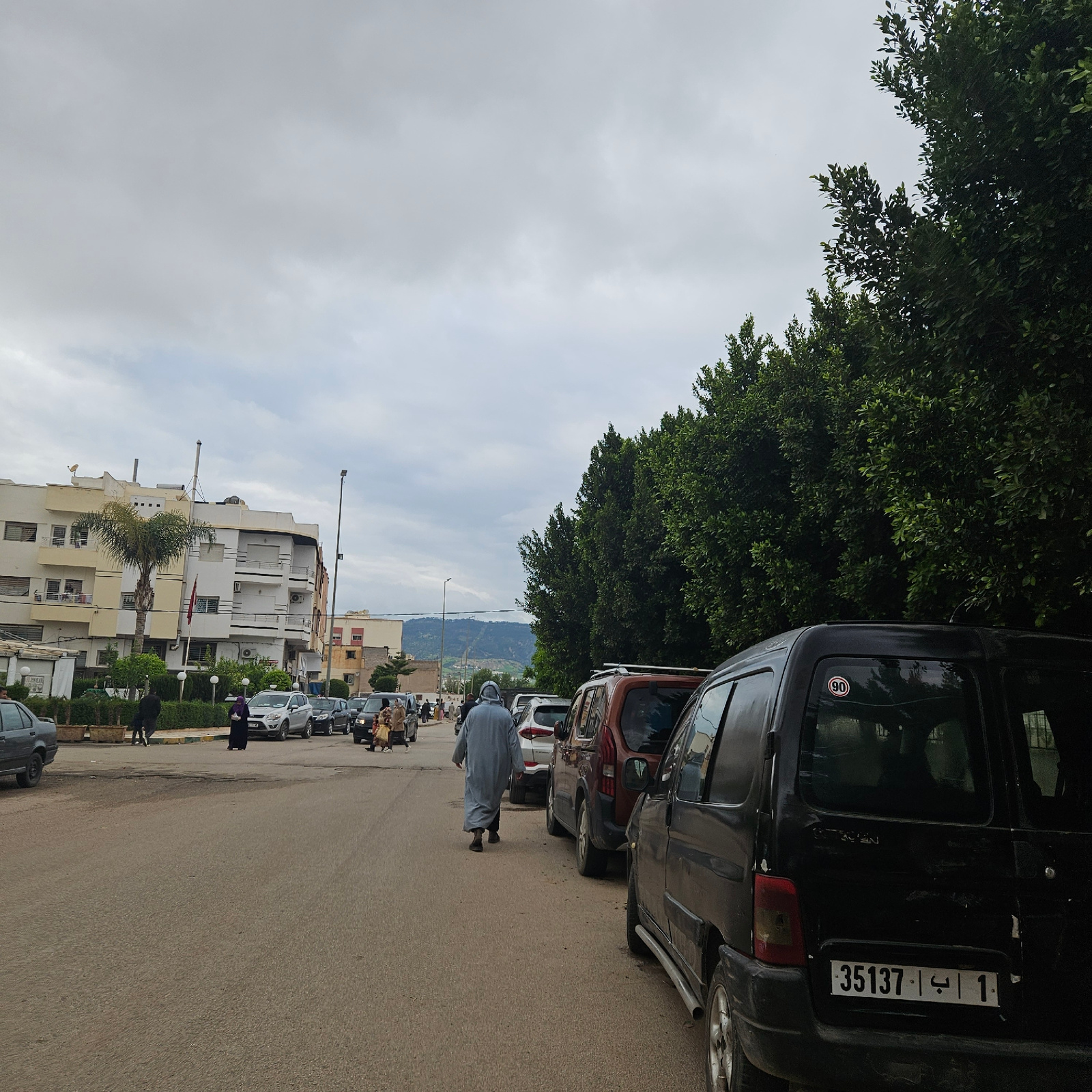 The image shows a street scene in Fez, Morocco. Cars are parked along the right side of the street, with a large tree canopy providing shade in the upper left. A man in traditional clothing walks along the street. In the background, buildings and a distant mountain range are visible under a cloudy sky. The license plate number on the black car in the foreground is 35137-1. | Open Wire