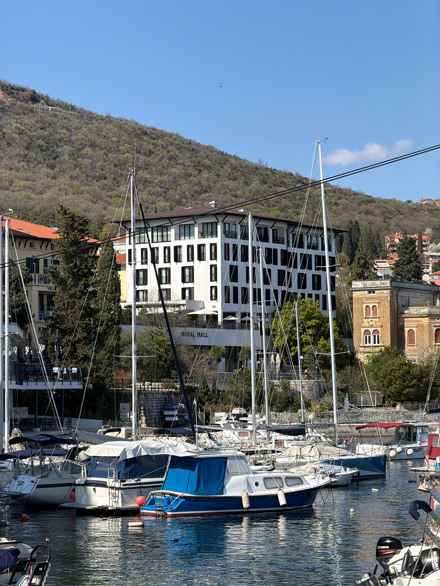 The image depicts a marina in Grad Opatija, Croatia, on a clear, sunny day. In the foreground, numerous boats are moored in calm, dark blue water. Several sailboats with prominent white masts and rigg…read more