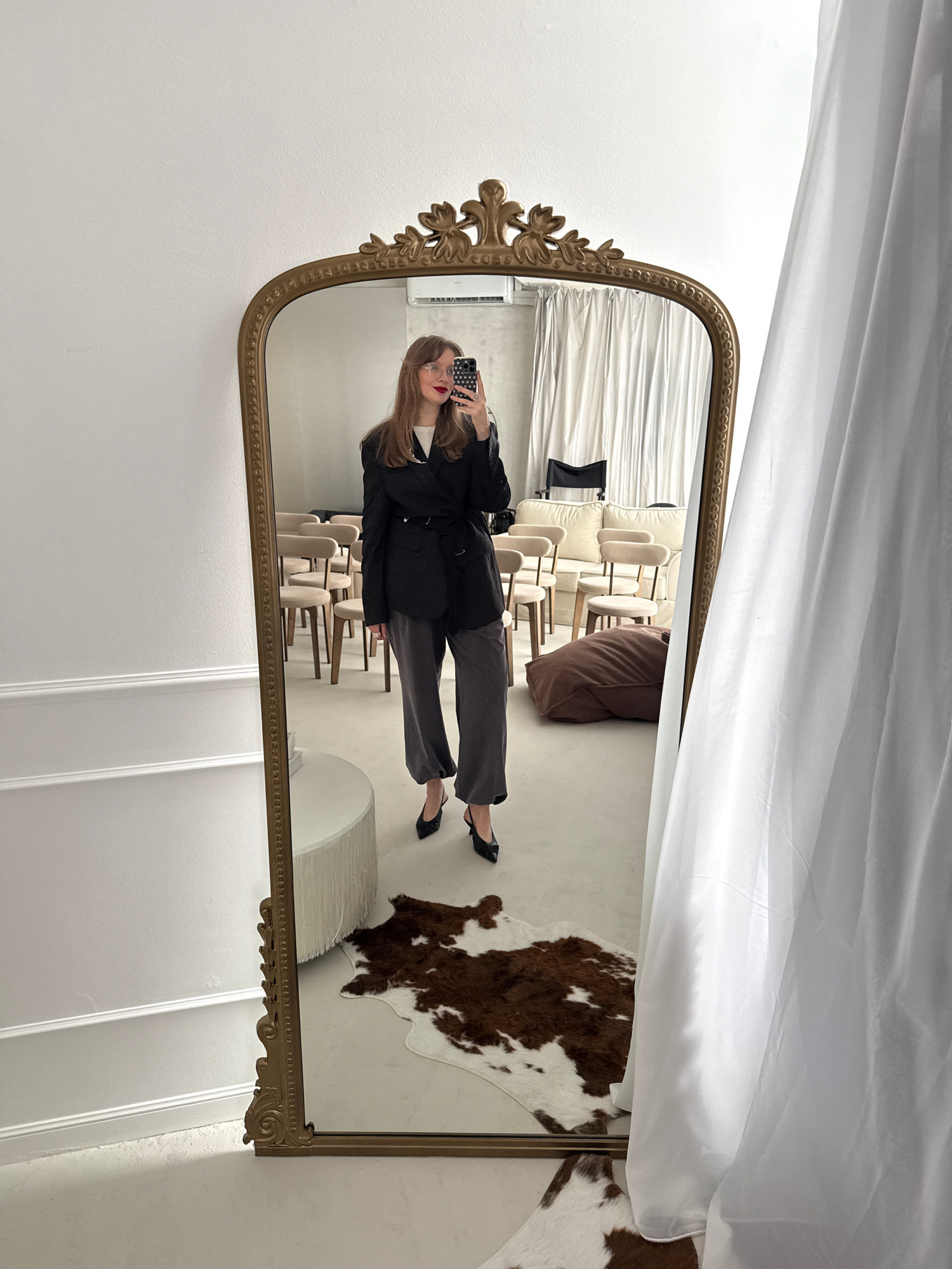 A mirror reflects a woman taking a photo. She is wearing a black blazer, gray pants, and black heels. The setting includes decorative white drapes at the top, a faux cowhide rug, a modern white table…read more