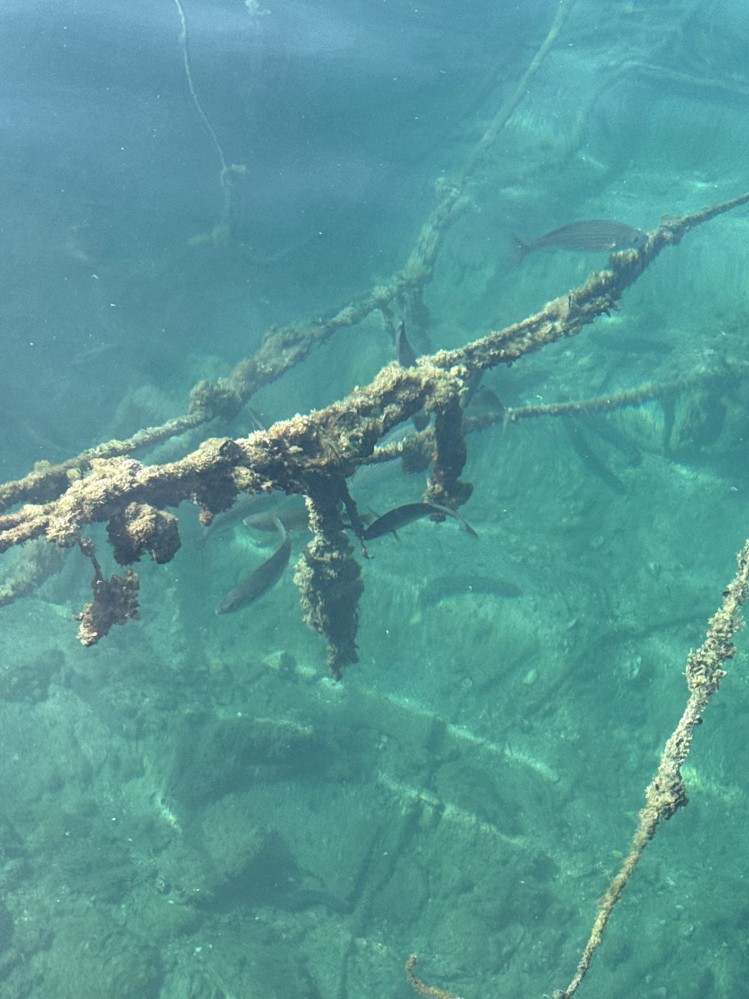 The image depicts underwater ropes covered in marine growth, with several fish swimming around them. The water is clear and turquoise. The ropes are heavily encrusted with what appears to be algae or…read more