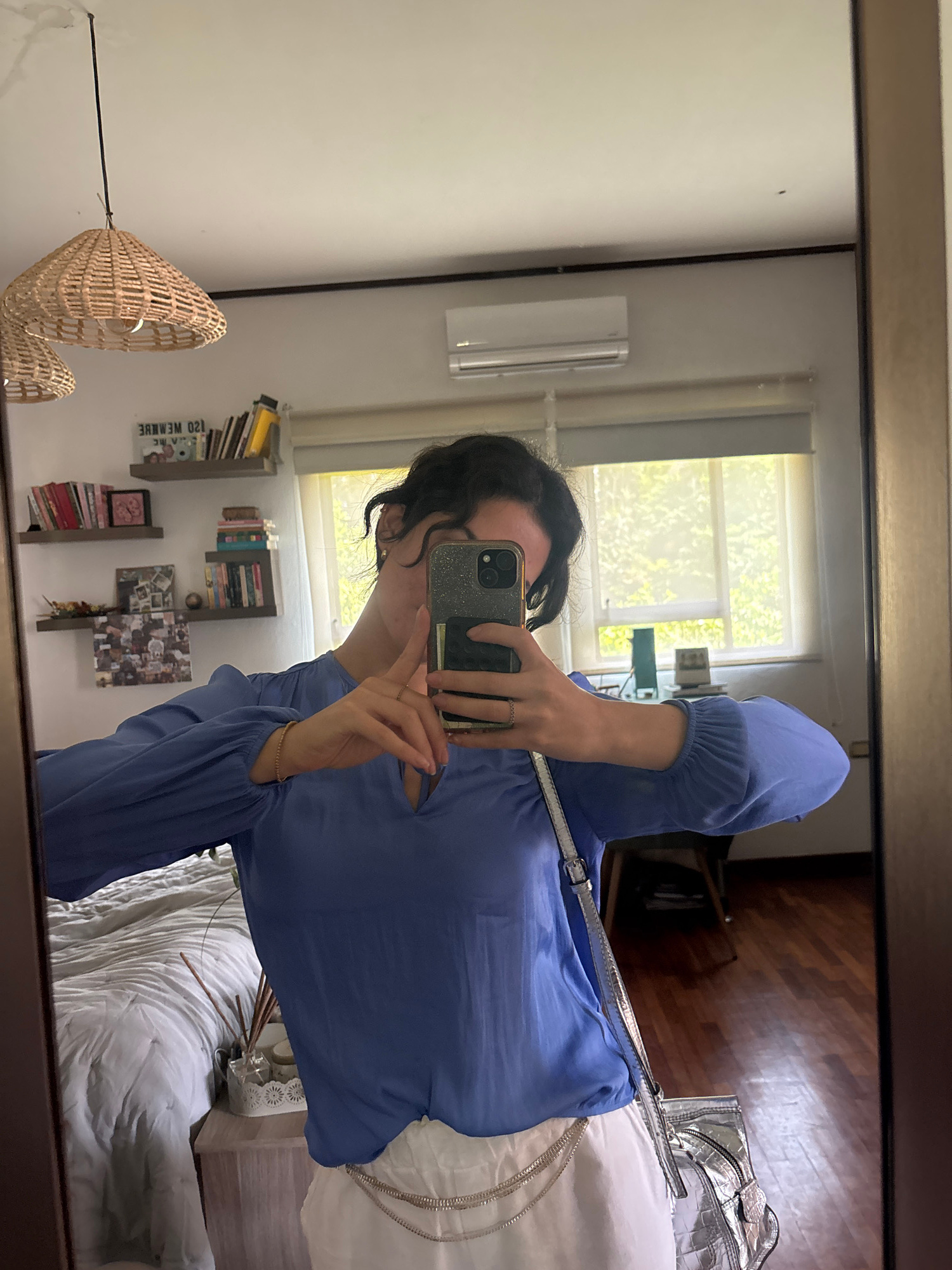 A woman is taking a mirror selfie in a room. The woman is wearing a blue blouse and white pants. There is a silver purse to the right of her. Behind the woman is a window with natural light streaming…read more