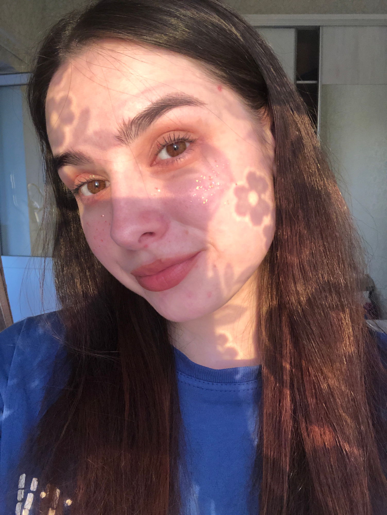 A young woman with brown hair and brown eyes is depicted in a close-up photograph. She is wearing a blue t-shirt and has flower-shaped shadows cast on her face. Her skin appears to have glitter on it.…read more