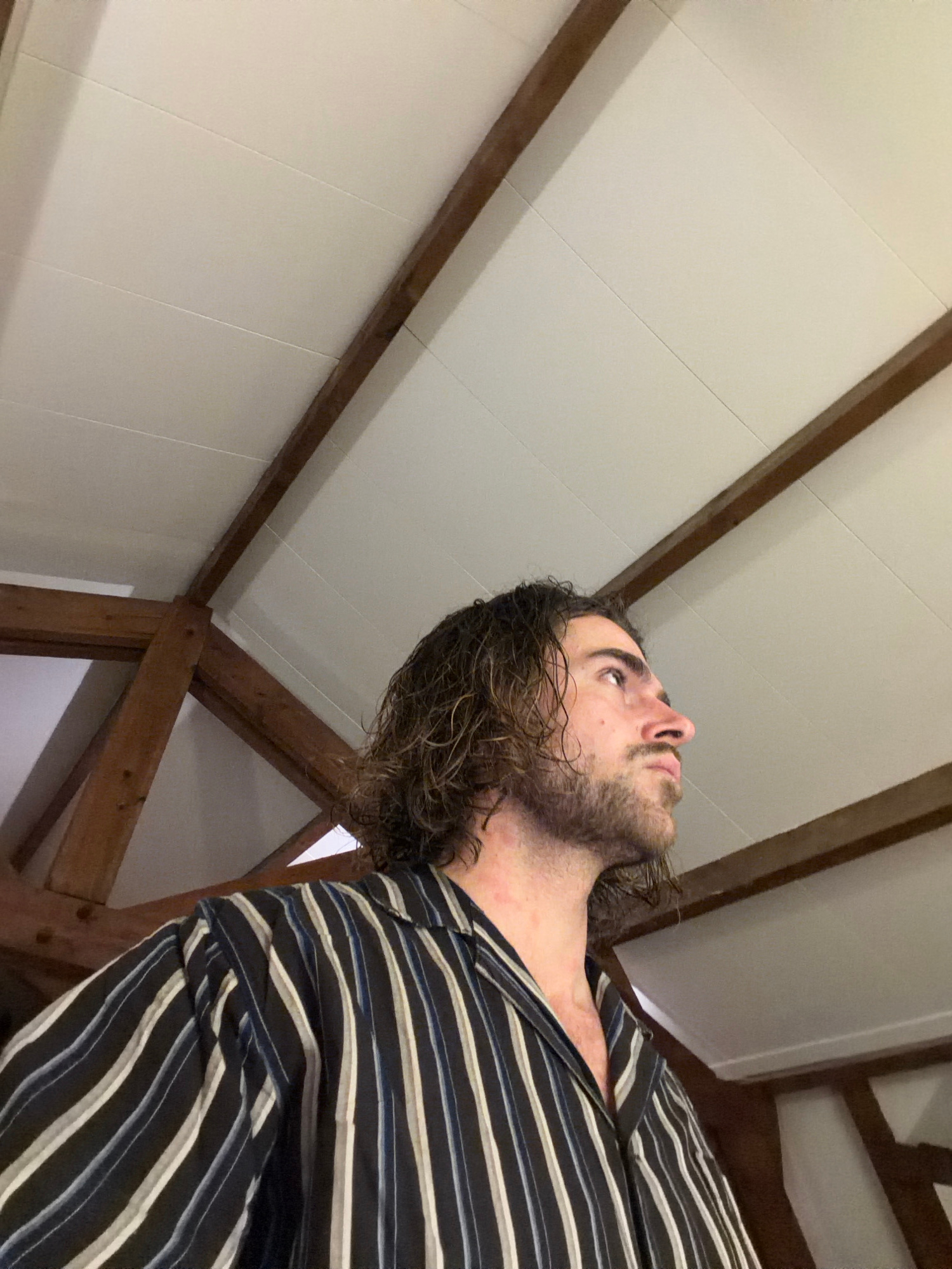 A low-angle shot depicts a man with long, wavy brown hair and a beard, wearing a striped shirt. He is looking upwards. The background reveals an interior space with white paneled walls and wooden beam…read more