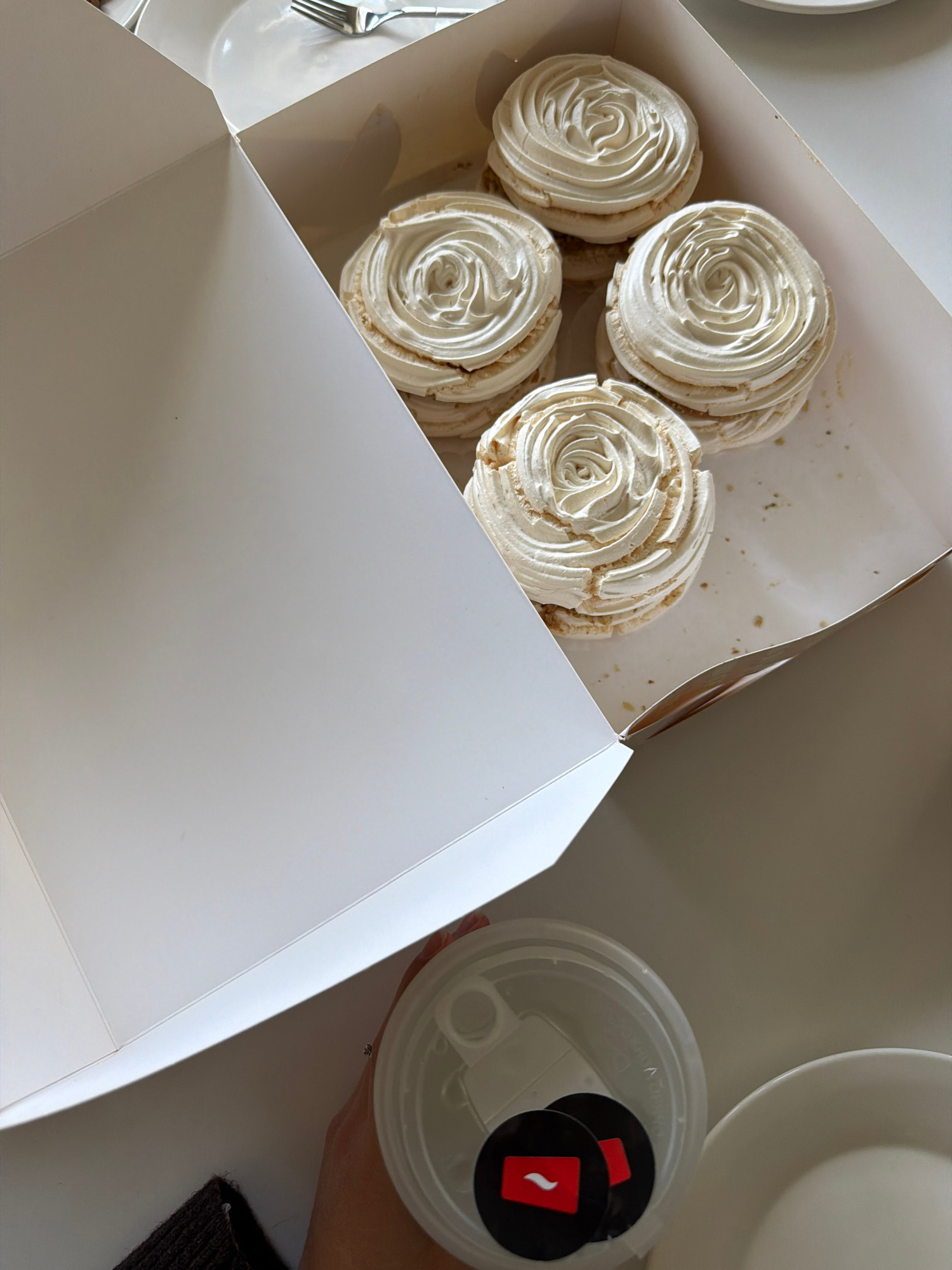 A high-angle shot depicts an open white box containing five meringues, characterized by a swirled cream topping. Adjacent to the box, a clear plastic cup with two circular black stickers bearing a sty…read more