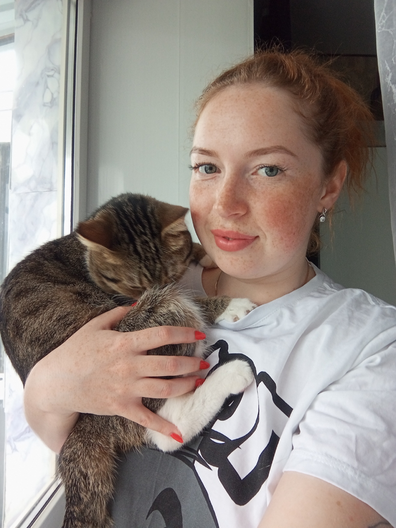 A young, light-skinned woman with freckles and red nail polish is holding a tabby cat. She has red hair and blue eyes, and is wearing a white t-shirt with a black design. The cat is resting on her che…read more