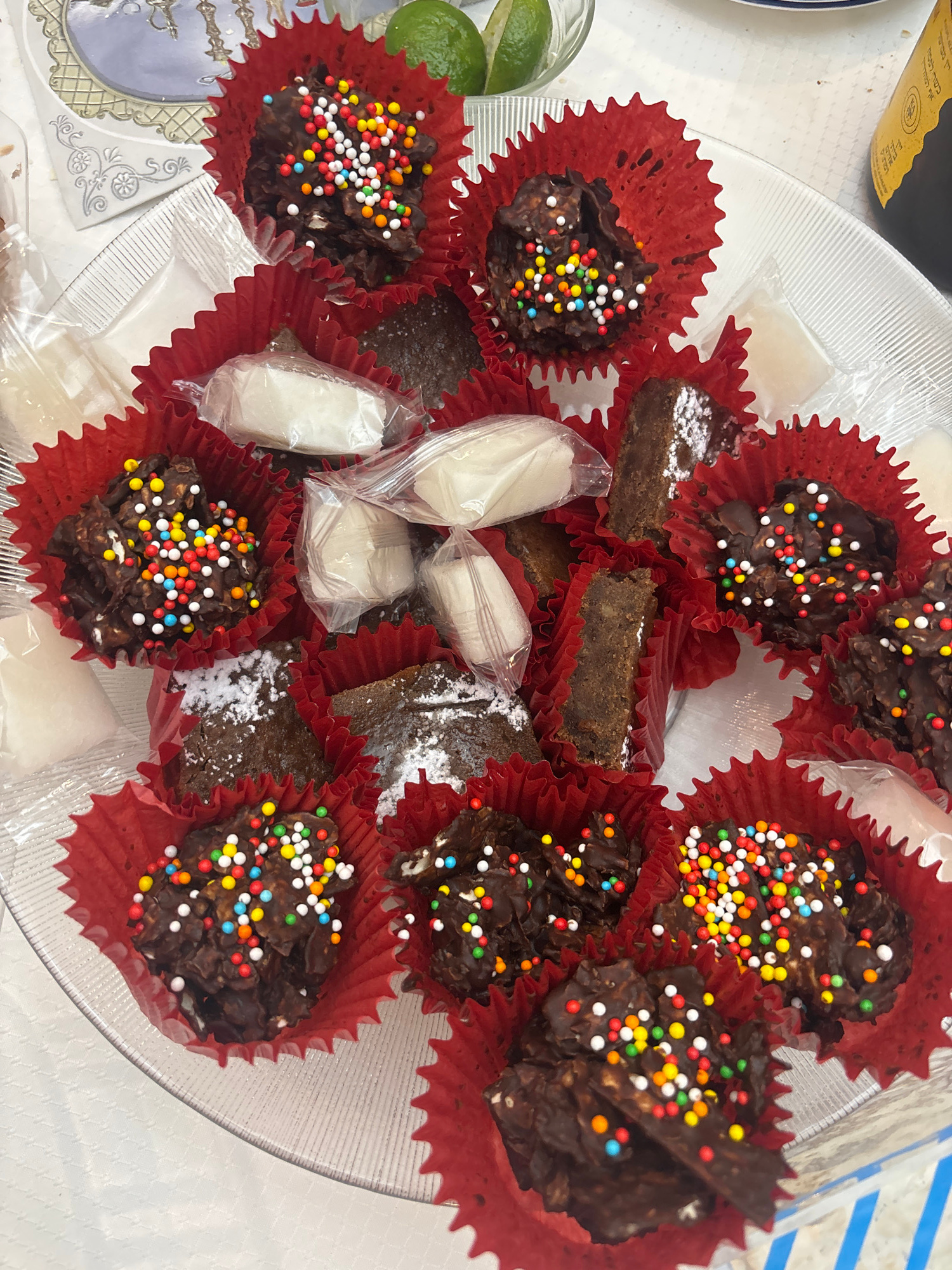 A clear glass plate filled with an assortment of sweets in red paper cupcake liners is displayed. Some of the treats are chocolate clusters with colorful sprinkles, while others appear to be brownies,…read more