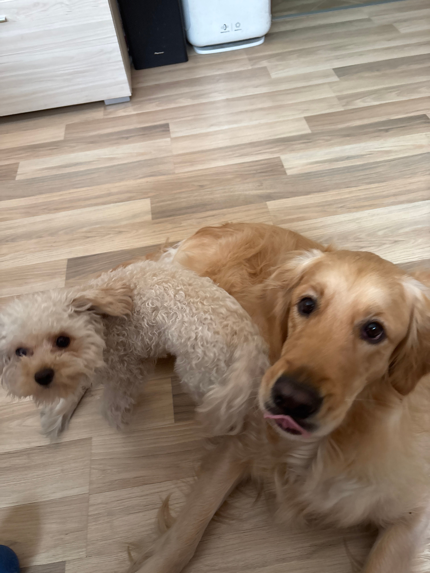 The image depicts a golden retriever lying on a light-colored, wood-patterned floor, with a smaller, light-brown poodle partially underneath it. The retriever has its tongue slightly protruding. In th…read more