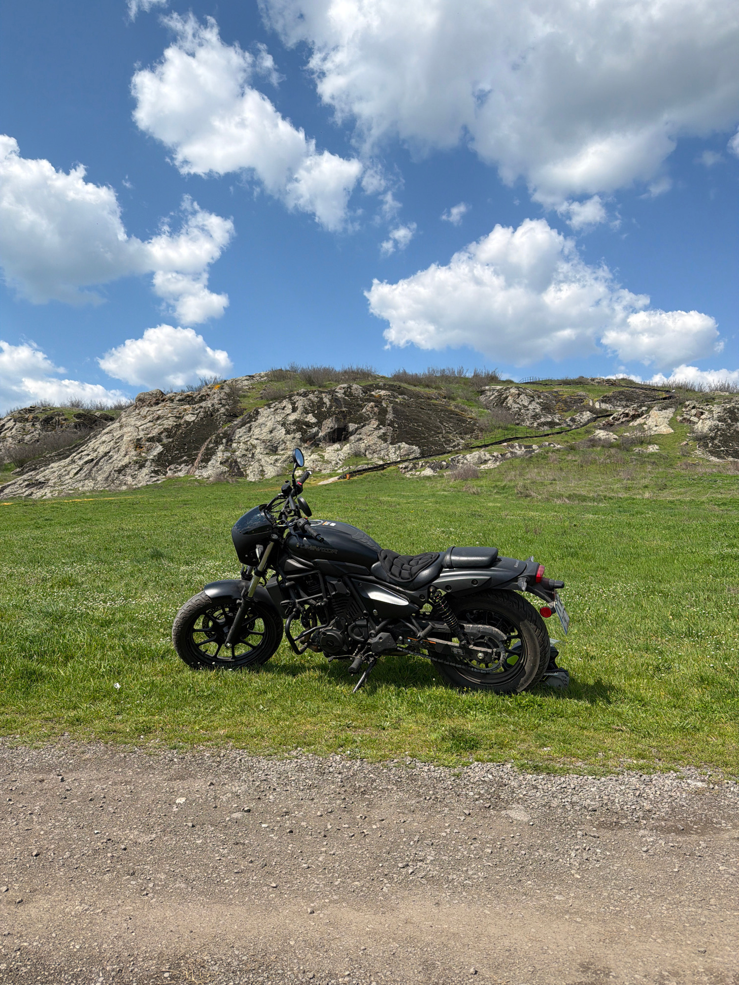 A black motorcycle is parked on a grassy area adjacent to a dirt road. Behind the motorcycle is a rocky hillside. The sky is blue with scattered white clouds. The location is Rusokastro, Bulgaria.