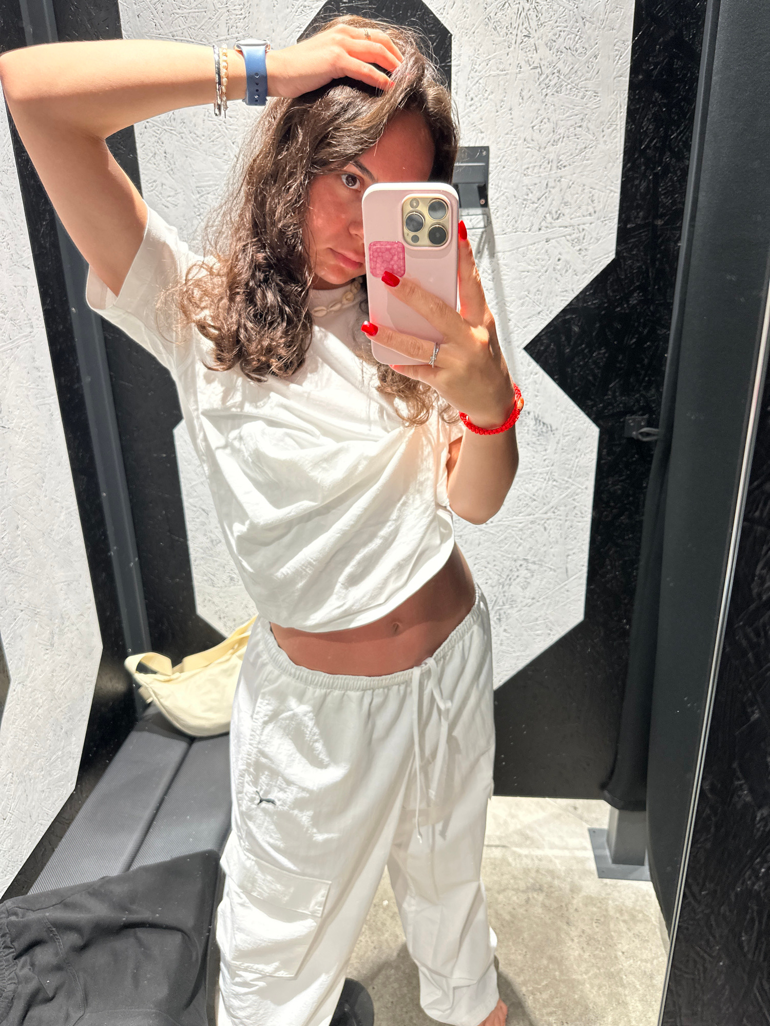 A person with long, curly brown hair is taking a selfie in a mirror. The person is wearing a white t-shirt and white sweatpants. A red bracelet is on their right wrist. The phone is pink. The backgrou…read more
