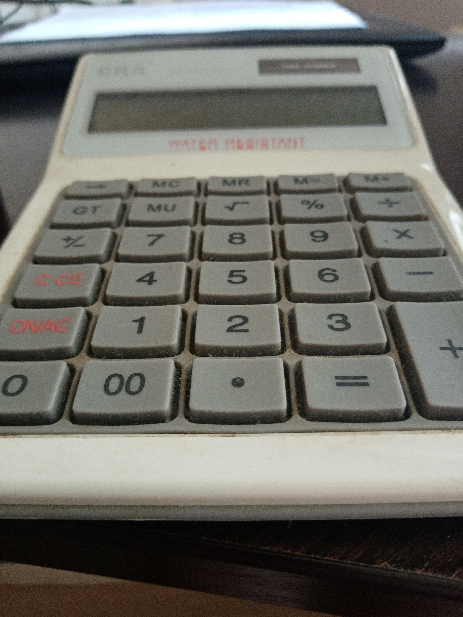 The image shows a close-up view of a well-used, off-white calculator. The calculator has gray rectangular buttons with black or red markings. The markings include digits, mathematical symbols, and abb…read more