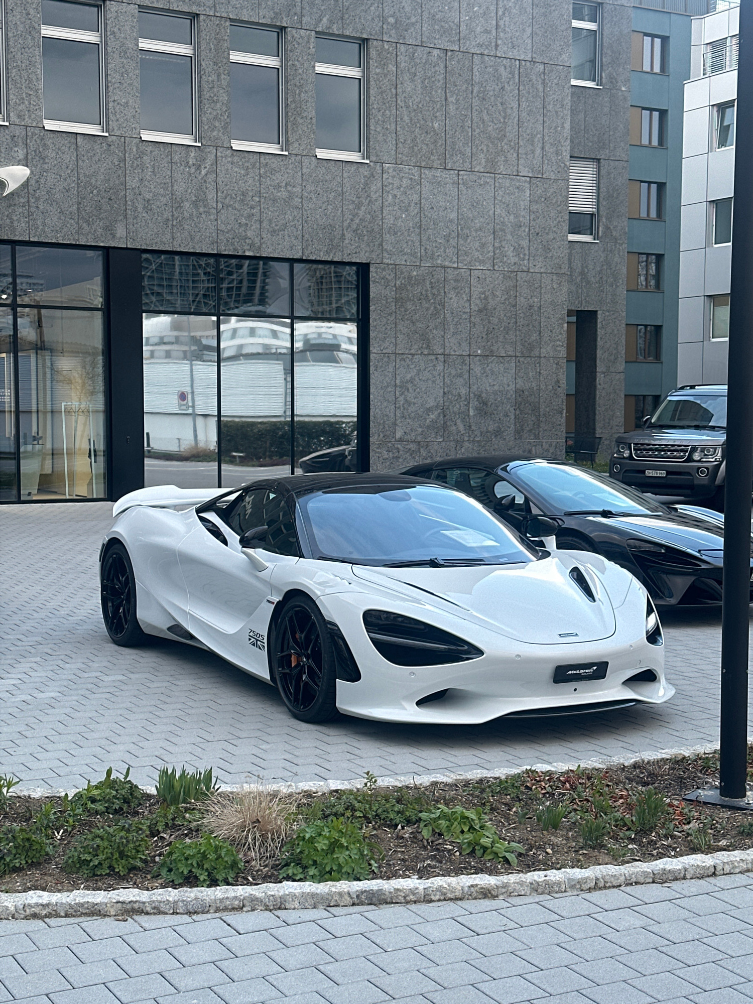 The image shows a white McLaren 750S parked on a paved surface next to a modern building with a grey facade and large windows. A black SUV is partially visible behind the McLaren. There is a narrow st…read more