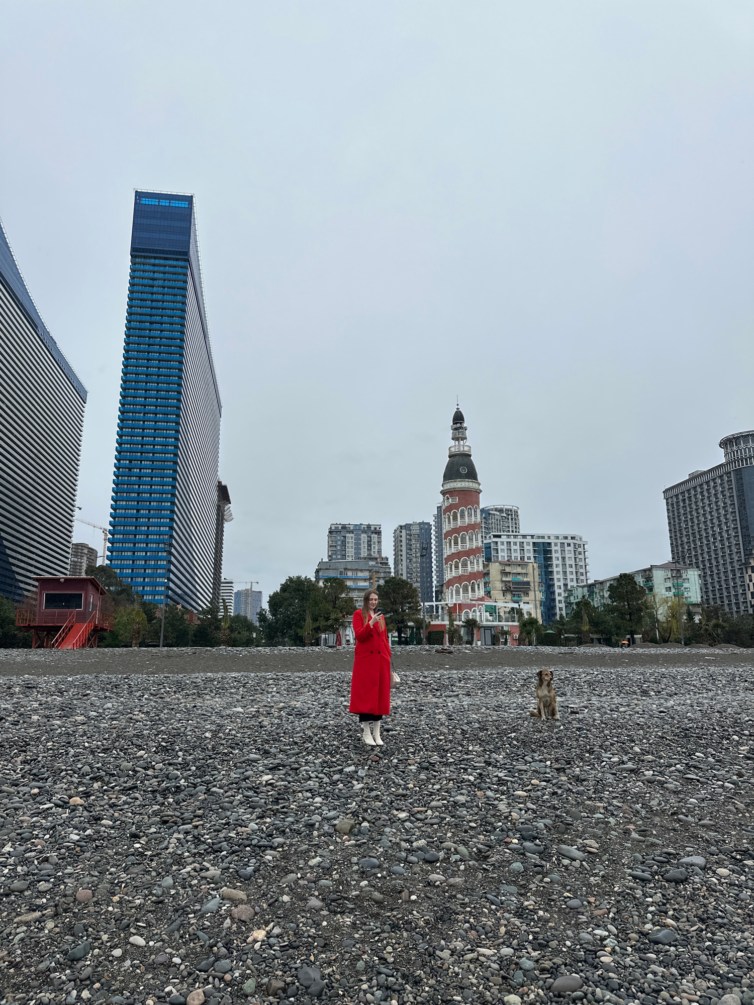 The photograph depicts a person wearing a bright red coat and white boots standing on a pebble beach in Batumi, Georgia. In the background is a skyline of modern and older architectural buildings, inc…read more
