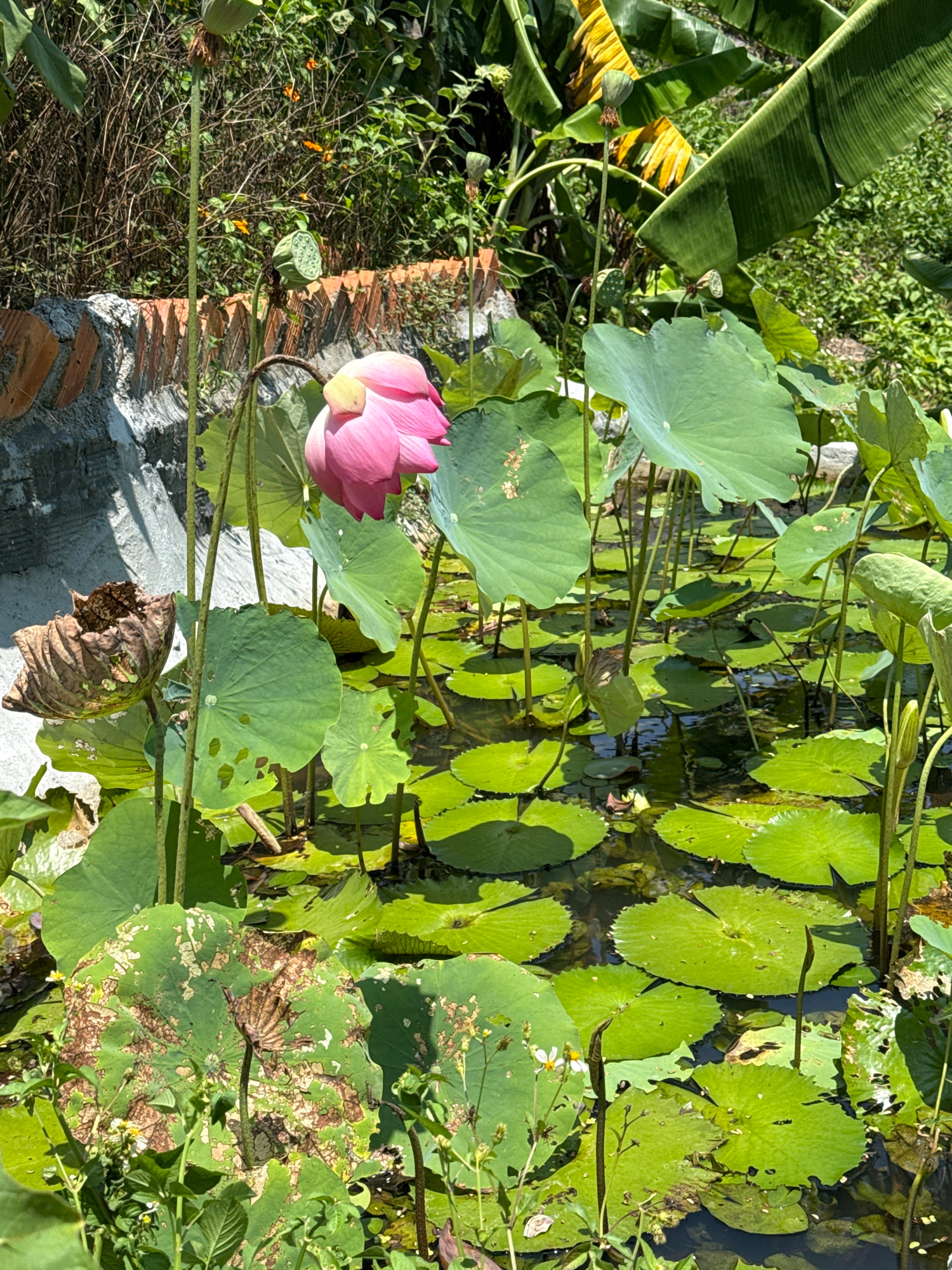 The image shows a pond scene with a pink lotus flower in bloom. The flower is positioned near a rough brick and concrete border, suggesting a constructed or landscaped pond. The pond is filled with nu…read more