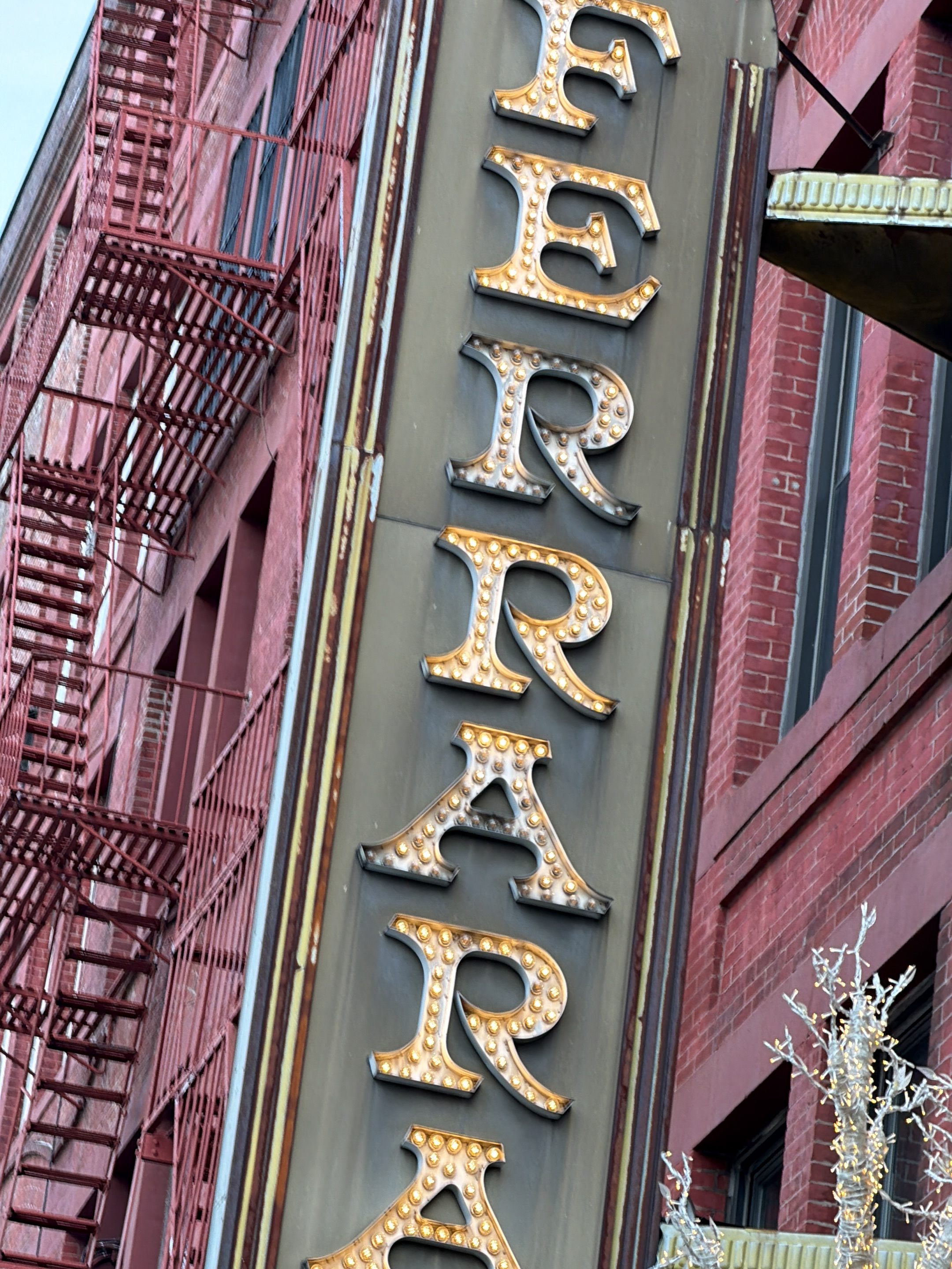 The image captures a partial view of the "Ferrara" sign in New York City's Little Italy neighborhood. The sign is mounted on the side of a building, and part of a red brick building with a fire escape…read more