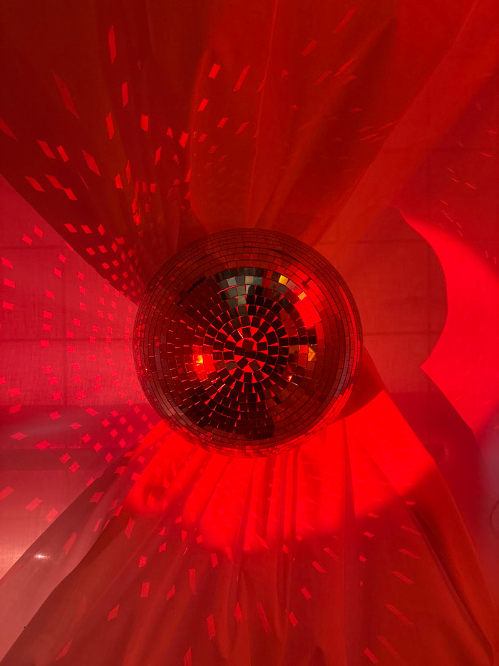 A central disco ball scatters red light across a gauzy fabric backdrop. The fabric's folds and curves add depth and texture, creating a dynamic interplay of light and shadow. The ball itself is compos…read more