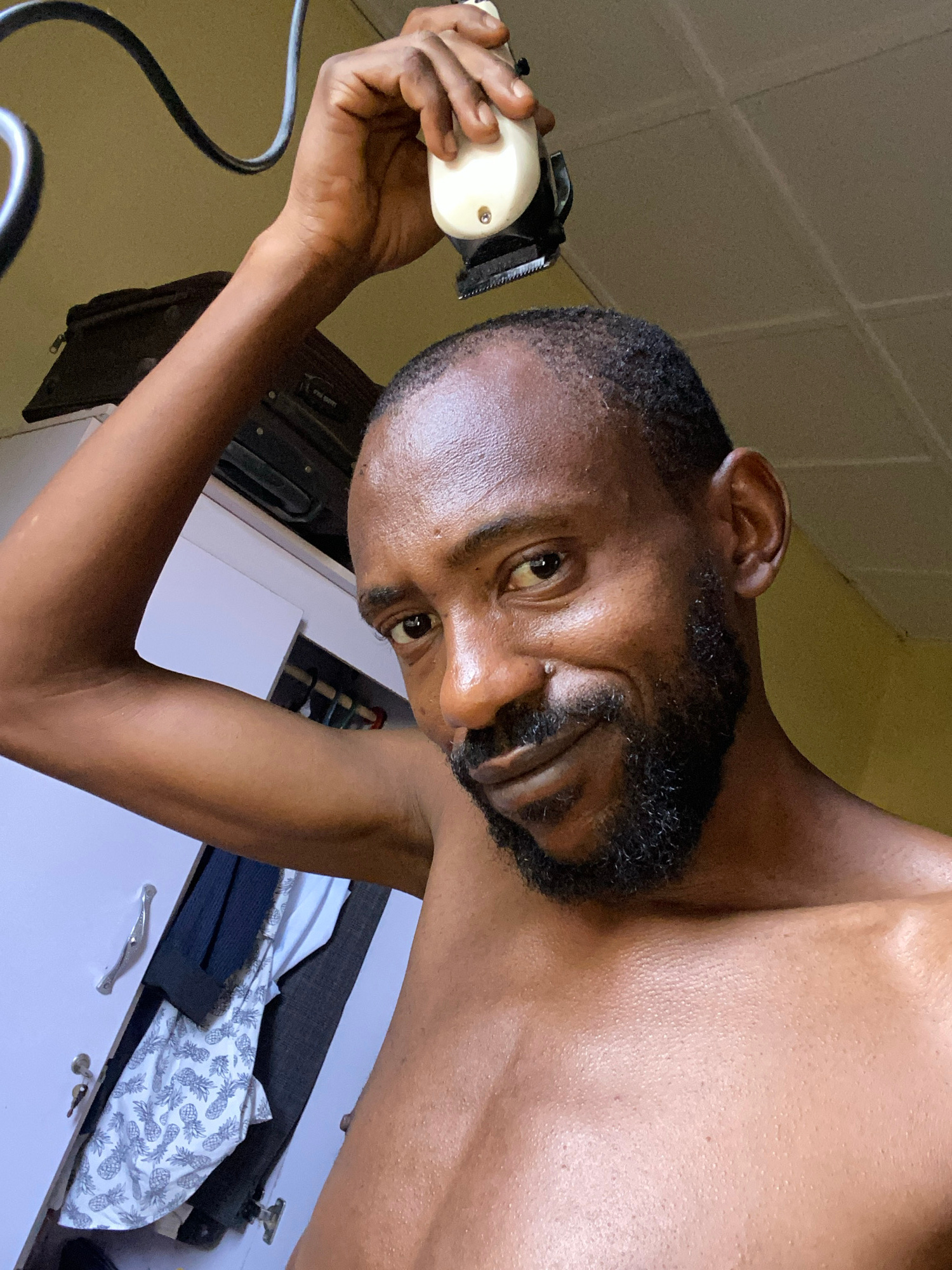 A shirtless man with dark skin, a closely-cropped head of hair, and a full beard holds an electric hair clipper in his right hand. He is looking toward the camera with a serious expression. The backgr…read more