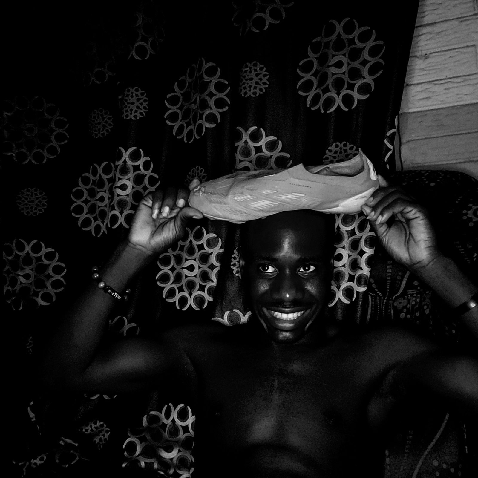 A black and white, high-angle portrait features an individual with dark skin lying on their back, smiling broadly, and holding a light-colored sports shoe. The person is looking directly at the cameraβ¦read more