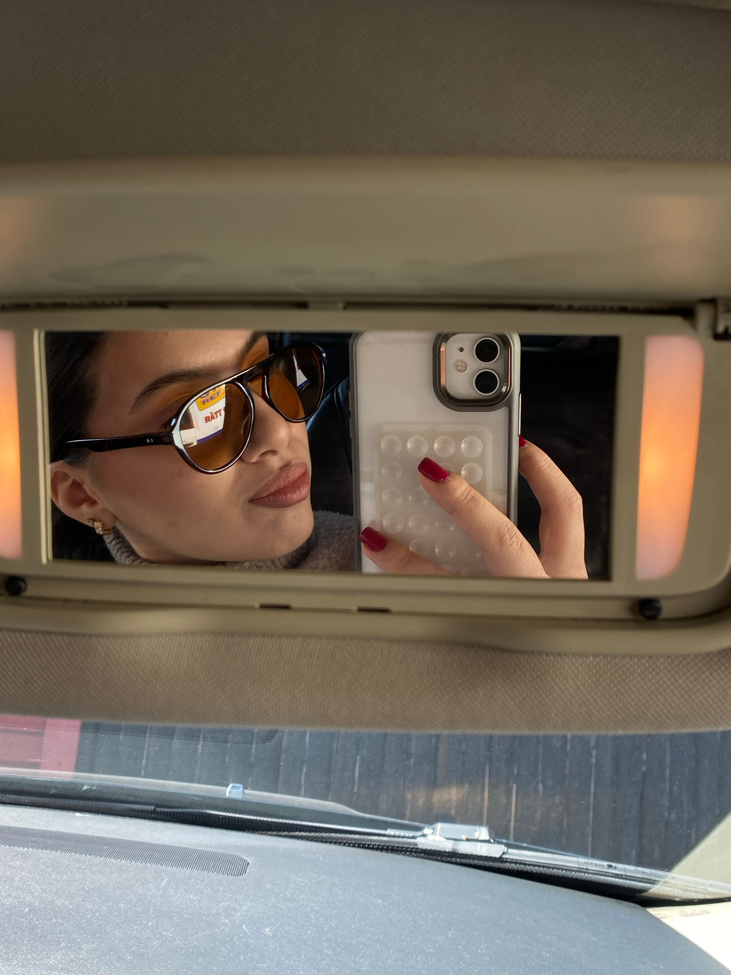 A selfie of a woman in a car mirror is the central focus. The woman is wearing sunglasses with a label or tag visible inside one lens. She is holding a white smartphone with two camera lenses in a han…read more
