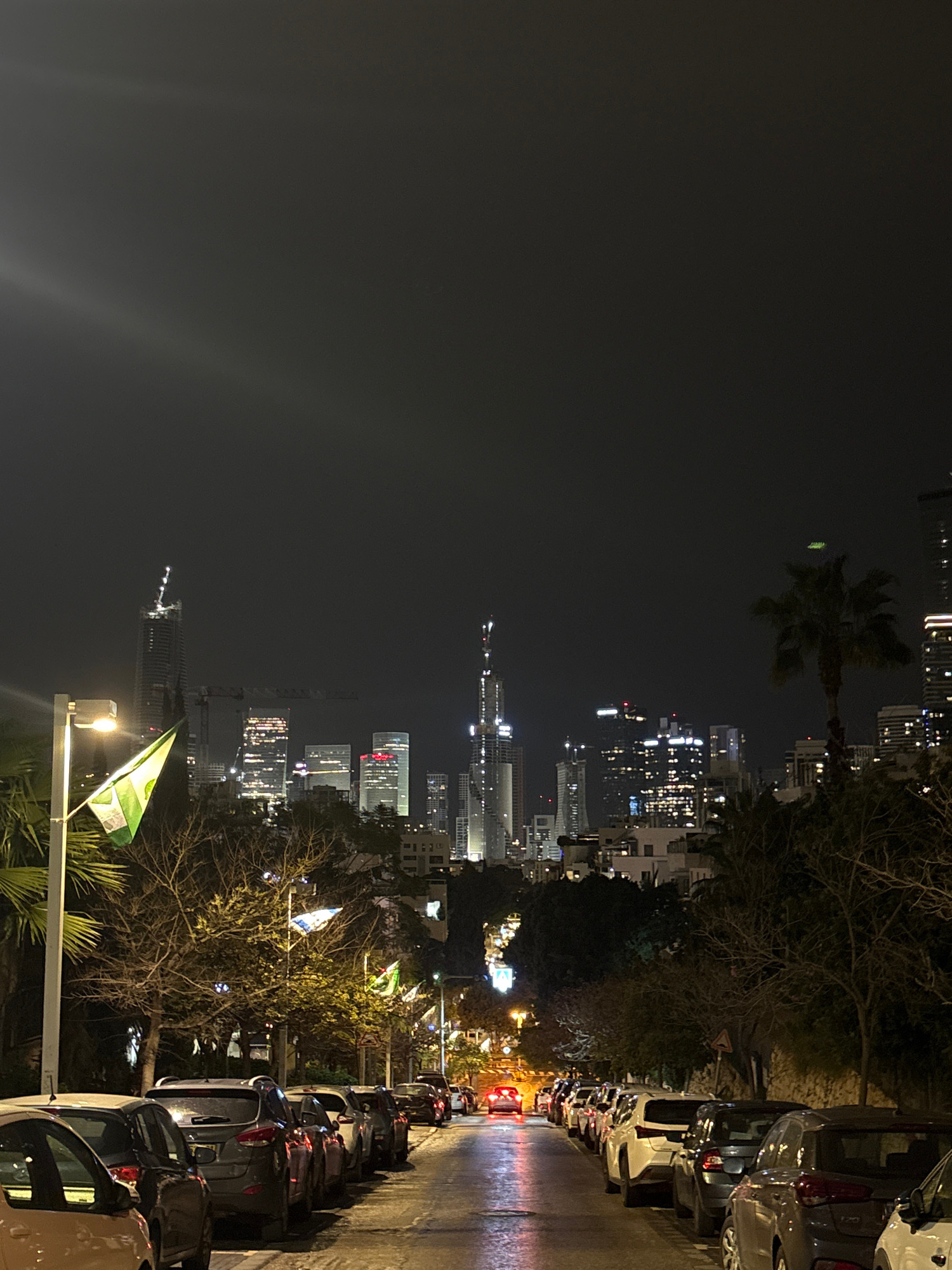 A night scene in Ramat Gan, Israel, shows a row of parked cars along a street. A cityscape skyline is visible in the background with illuminated buildings. Palm trees and other foliage border the stre…read more