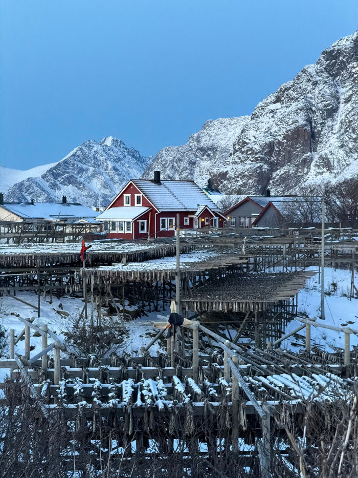 A winter landscape features a red wooden house with a snow-covered roof, nestled against a backdrop of steep, snow-covered mountains under a clear blue sky. In the foreground, a series of wooden racks…read more