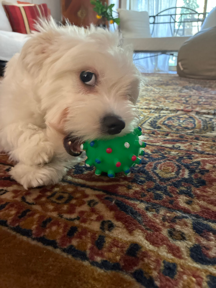 An indoor scene in Vouliagmeni Municipal Unit, Greece, depicts a white-furred dog, possibly a Maltese, lying on an ornate rug. The dog's left side faces the viewer, its body resting on its front paws.…read more