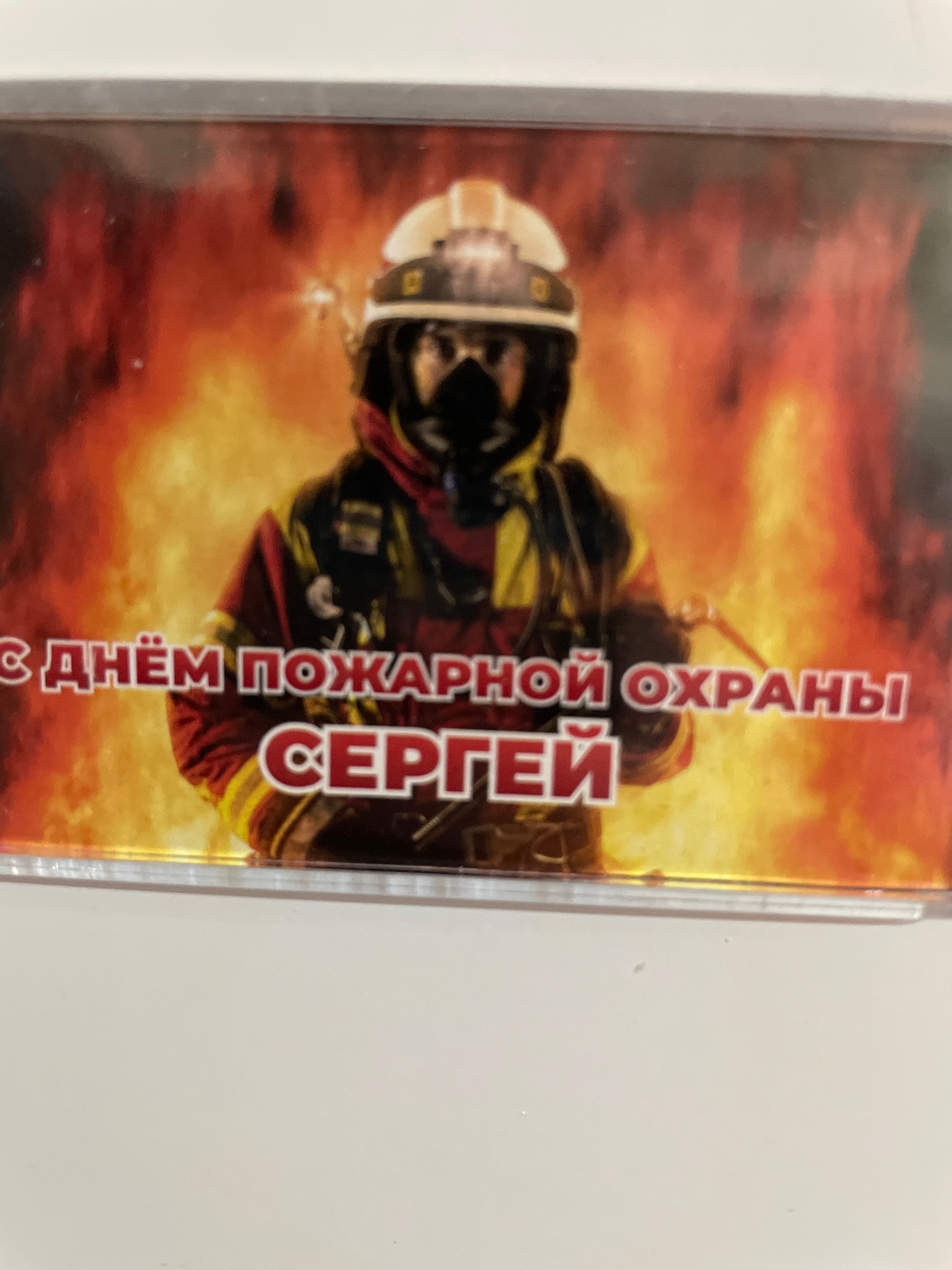 A laminated card or picture shows a firefighter in gear, centered against a fiery background. Vertical Cyrillic text on the right side of the image reads "С Днём Пожарной Охраны Сергей," translating t…read more