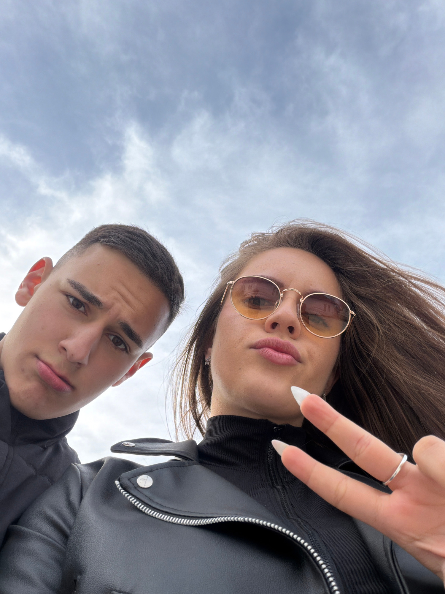 A low-angle outdoor shot depicts a young woman and a young man against a cloudy sky. The woman is positioned higher in the frame, wearing sunglasses and a black jacket, with her hand gesturing a peace…read more