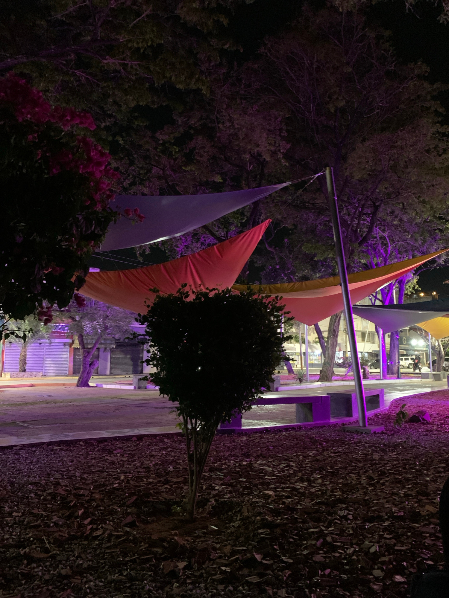The image shows an outdoor scene in Juan Griego, Venezuela, possibly a restaurant or gathering place at night. Overhead, several brightly colored, triangular fabric banners (gray, orange, yellow) are…read more