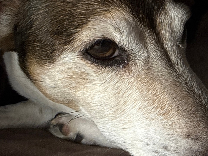In the city of Dubovaya, Russia, a close-up photographic image depicts the right side of a domestic canine's head. The animal exhibits a coat of fur with shades of brown, tan, and grey, along with a d…read more