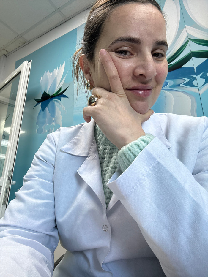 A female subject is depicted from the chest up in an indoor environment in Meknes, Morocco. She is wearing a light-colored lab coat over a mint green knitted sweater. Her left hand is positioned under…read more