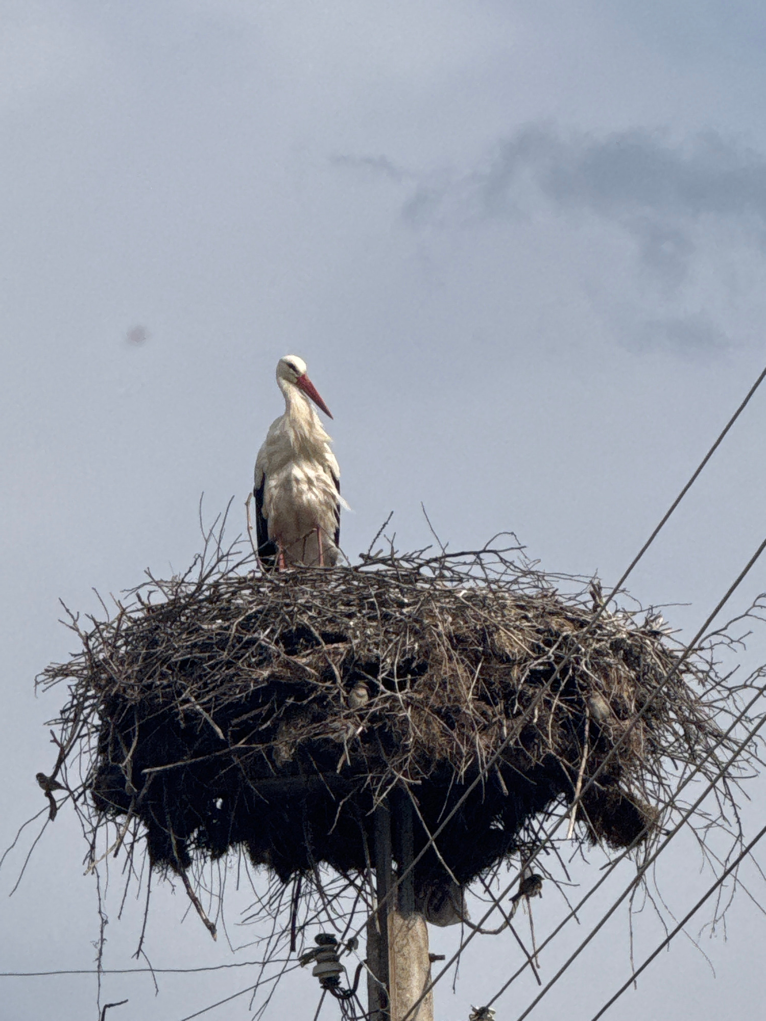 A stork is perched on a nest atop a utility pole in Krushovitsa, Bulgaria. The sky is overcast. The nest is large and constructed of twigs and branches. Power lines run above and around the nest. Elec…read more