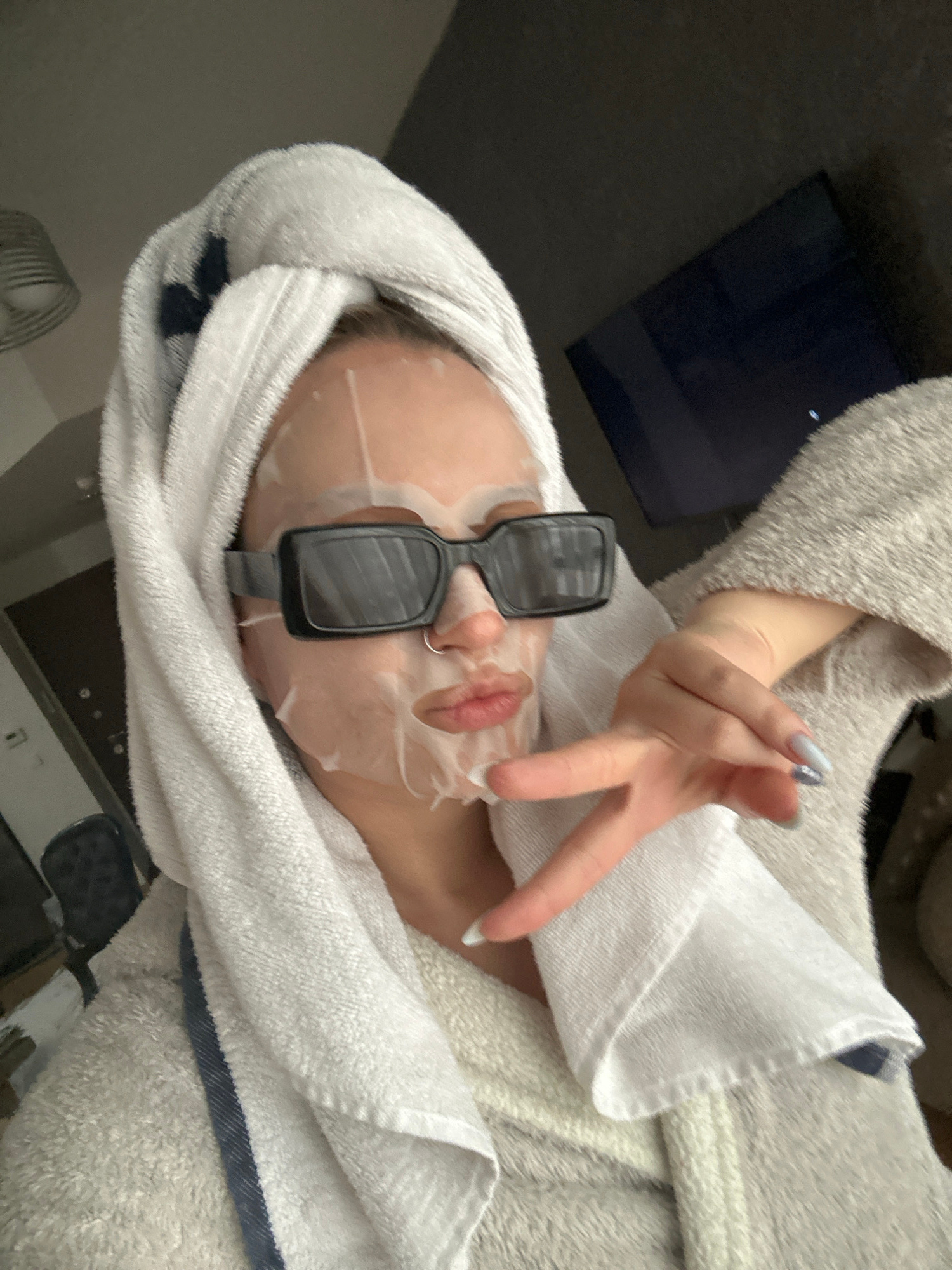 A woman in a gray bathrobe and white towel on her head is wearing a face mask and sunglasses. She is holding up two fingers in a peace sign. The location is not discernible from the image.