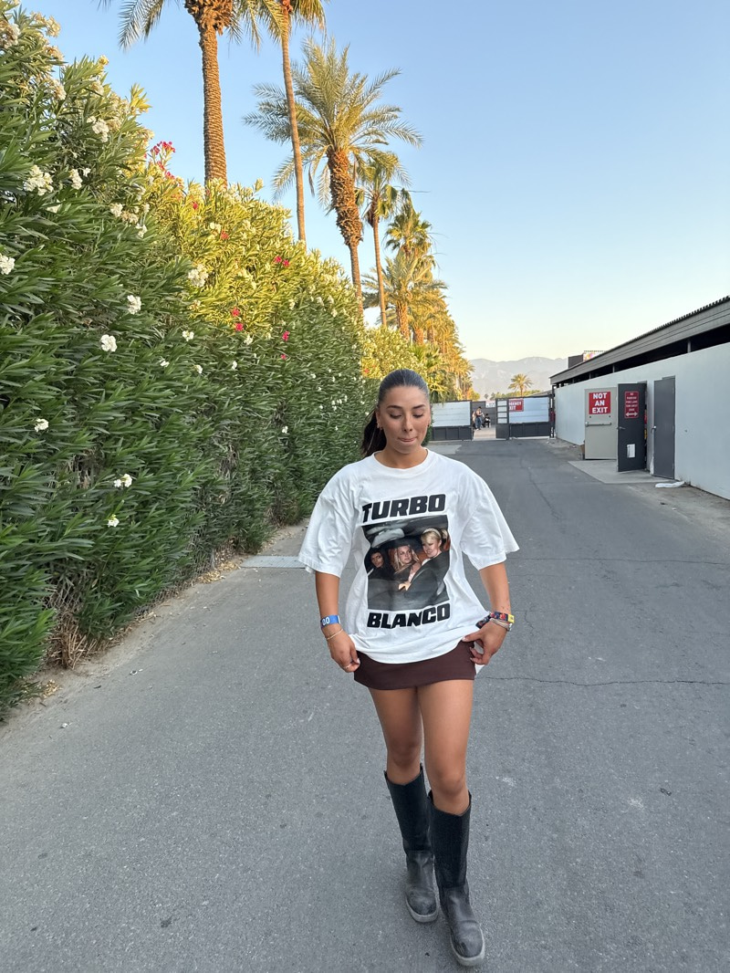 A young woman stands on a paved road in Indio, United States, with a line of trees and foliage to her left and building structures to her right. The woman wears a white t-shirt with a "Turbo Blanco" g…read more