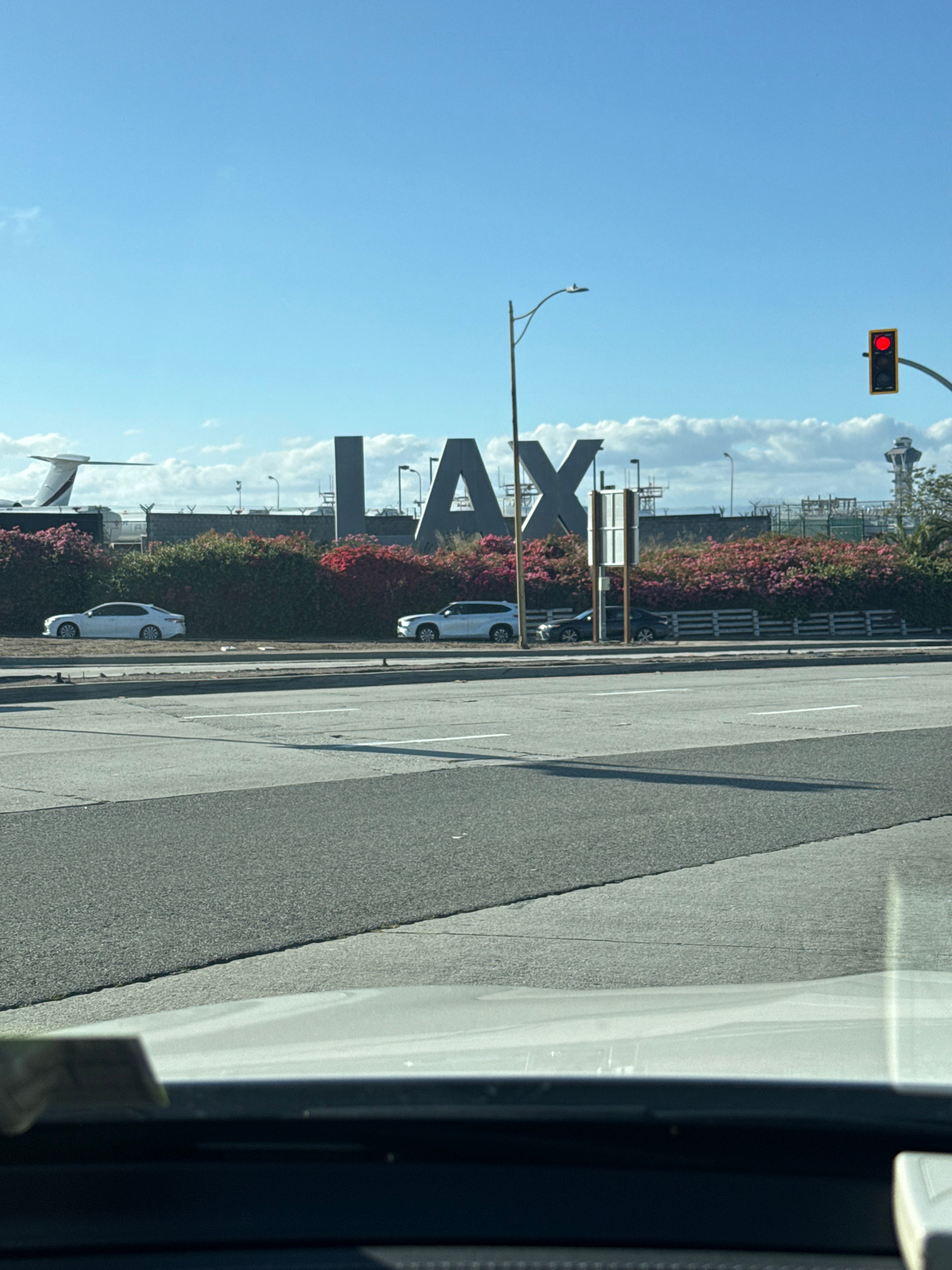 The image shows the iconic "LAX" sign located in Los Angeles, California. The sign is situated on the side of the road, adjacent to a flower hedge. There are some cars parked alongside the road next t…read more