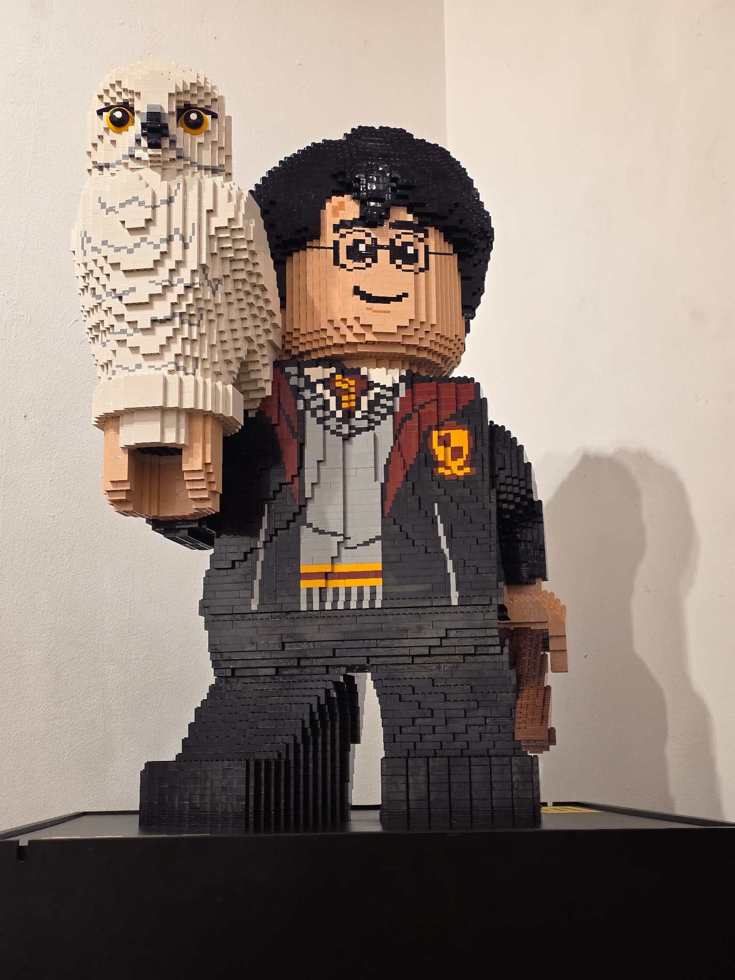 A Lego sculpture of Harry Potter holding his owl, Hedwig, is displayed on a vertical surface against a plain off-white wall. Harry is depicted wearing glasses, a Hogwarts uniform with the Gryffindor c…read more