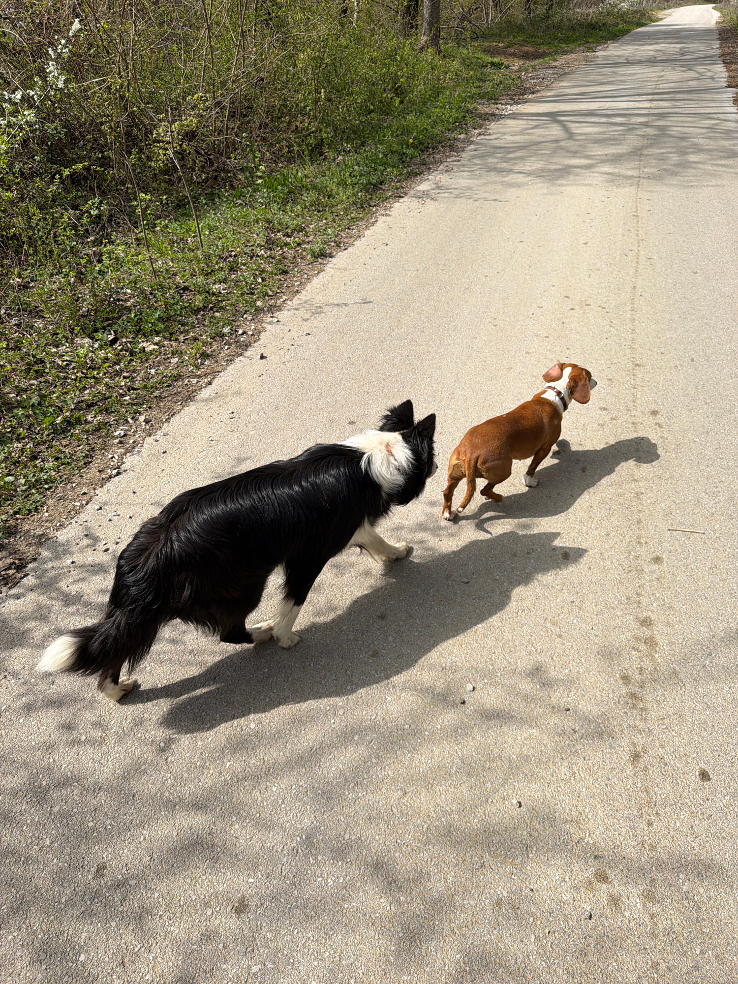 Two dogs are standing on a paved road. The dog closest to the foreground is black and white. The second dog, further away, is brown with a white collar. The shadow of each dog is visible on the road.…read more